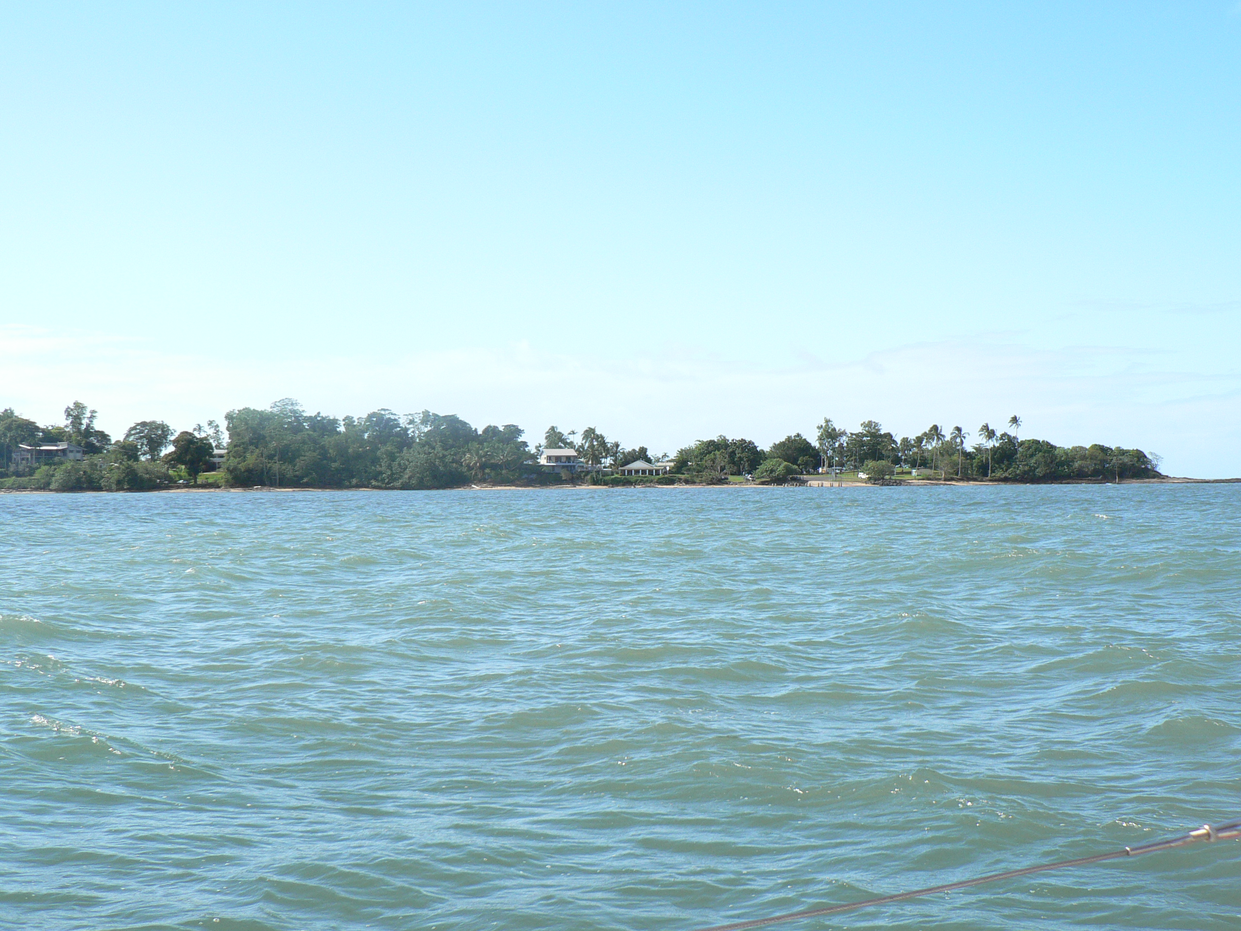 In accordance with our plan to sit out the wet and windy weather in Innisfail, we left Dunk Island, after a fairly unsettled night with a couple of 30 knot squalls passing through. Getting Paseafique across the entrance of the Johnstone River was going to be a challenge, even at high tide, as this area is very shallow and the sand bars shift around a bit. The particular high tide we were going in on was not predicted to be very high so we checked with the coast guard who told us that a boat with a 2M draft had recently got in with no problem. So we set off with the aim of arriving at the river entrance just on high ride, and consequently had busy morning trying to get our average speed about right – at one time being too fast, and then too slow, so there was lots of fiddling with the sails. We arrived at the entrance right on the appointed time and started the crossing- the shallowest water being just 0.6M under the keel. Flying Fish Point (isn’t that just a great name) is a very pretty spot just at the entrance there. With some relief we got into deeper water and motored up the river, again seeing some very shallow depths on our way up – 0.4M at one point.