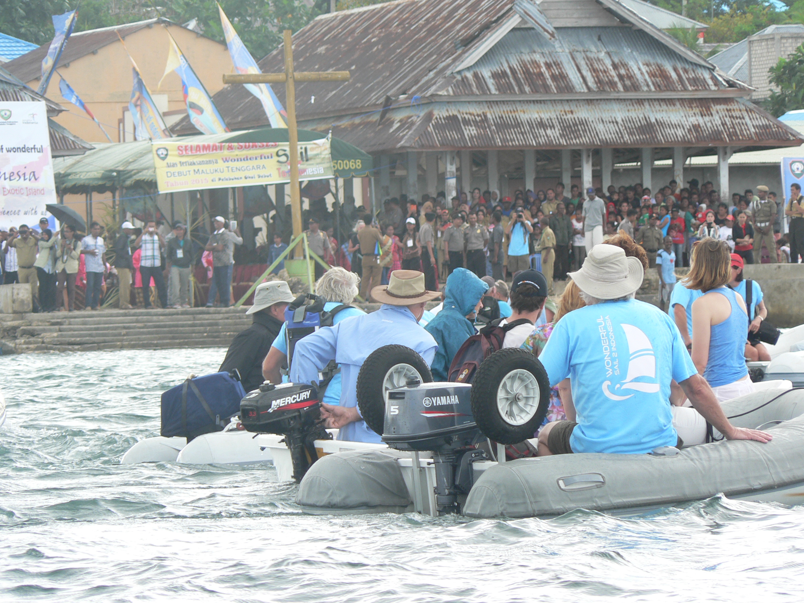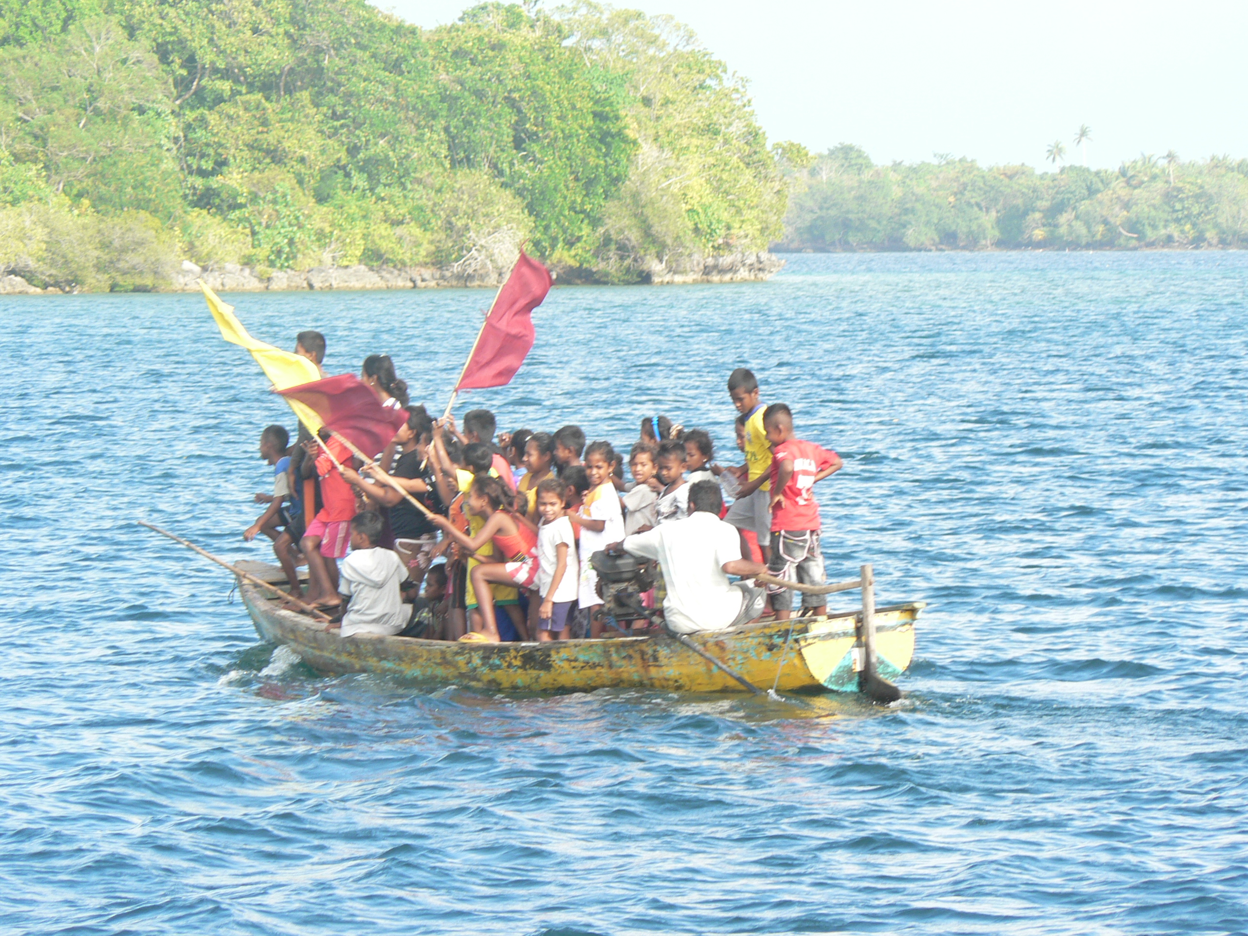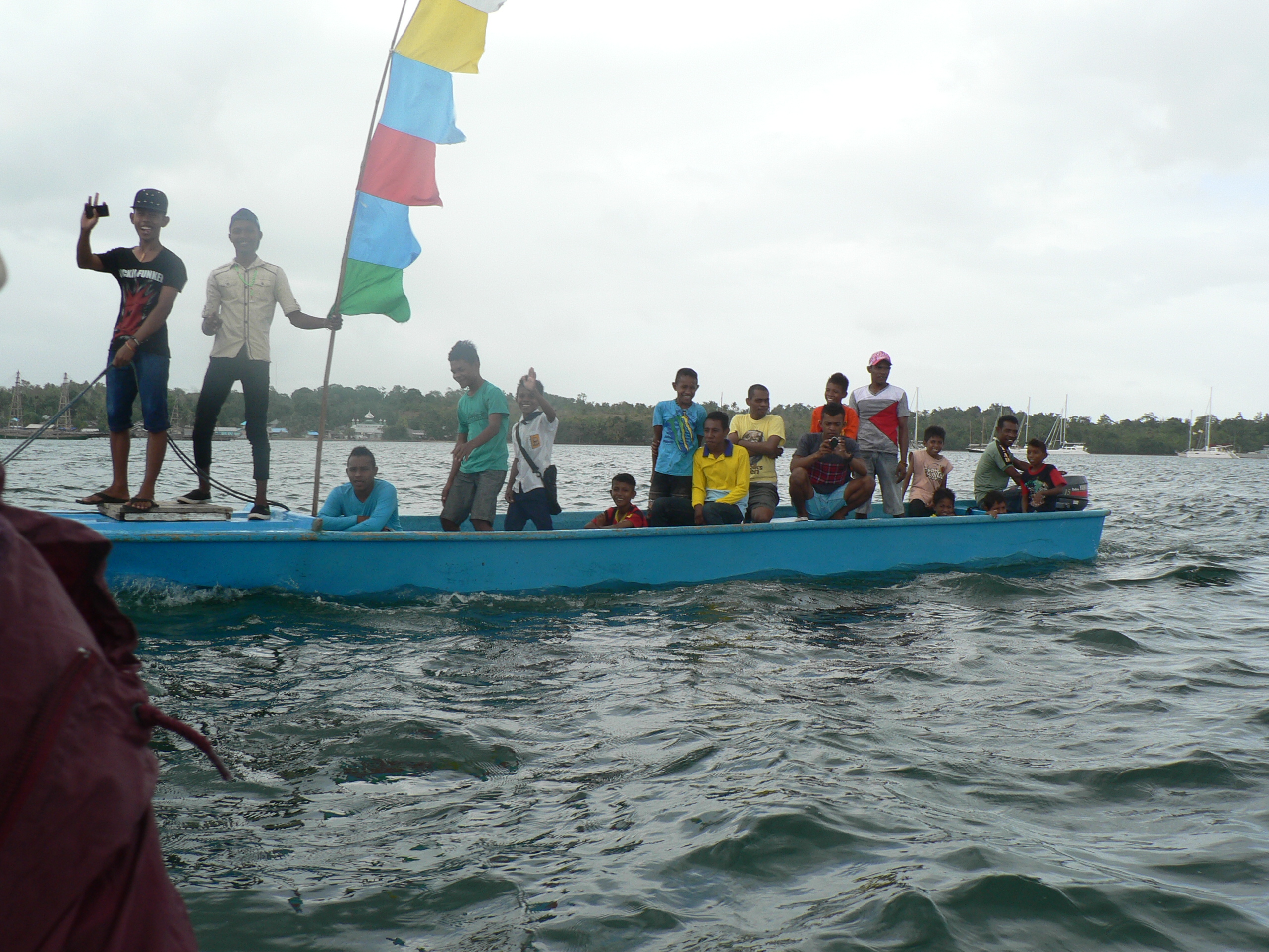 We arrived in Debut on Sunday 26th July exactly 96 hours after leaving Thursday Island, averaged 6.9kts for the four days. It was an exciting moment when we hoisted up the “Q” flag (to signify we were wanting clearance) and the Indonesian courtesy flag as we entered the harbour. We passed a small fishing boat on our way up the channel and when I called out “good morning” in Indonesian, they all waved madly with big grins. The locals had organised small powered boats (nothing like you might see in Australia) decorated with flags to come out into the channel and lead us into the harbour. Then just after we were anchored a boat full of children was going around the anchorage waving at everyone, cheering and singing- very cute at the time, but little did we realise that this was just the start of a lot, and I mean a lot, of attention we were to receive during our stay in Debut.