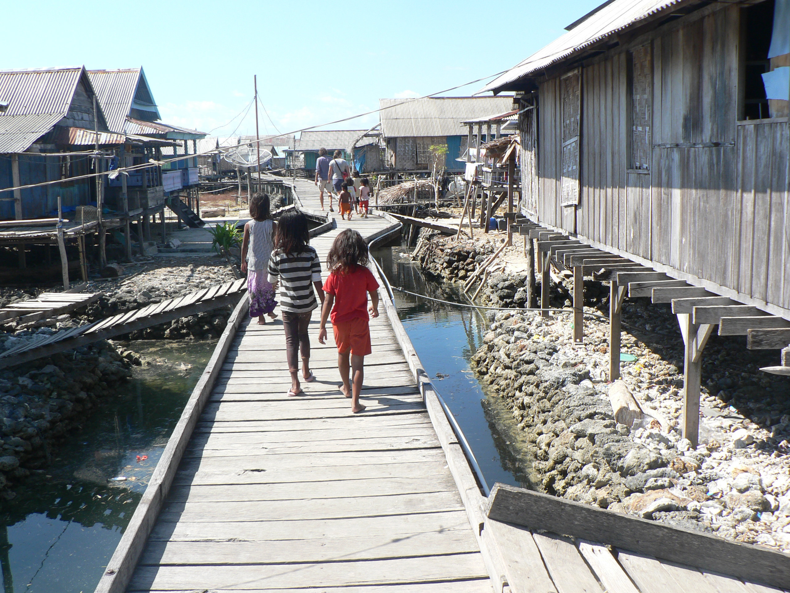 We also visited a stilt village inhabited by the last of Indonesia’s sea gypsies- I don’t quite understand how they can be gypsies if they live in a village but this is what I have been told. The village is built entirely on coral blocks which have been built up by hand in shallow water. Each house is built on stilts which sit on these rough coral blocks with the houses joined together by a boardwalk. We were welcomed “ashore” and spent a few hours wandering around accompanied by a band of children. The poverty and living conditions were a bit confronting, but the children at least seemed quite happy. A couple of the houses actually had a pool table underneath the house. There was no grass in this “village”, no crops and only a couple of forlorn banana trees. Goodness know what the free range chickens under the houses were eating.