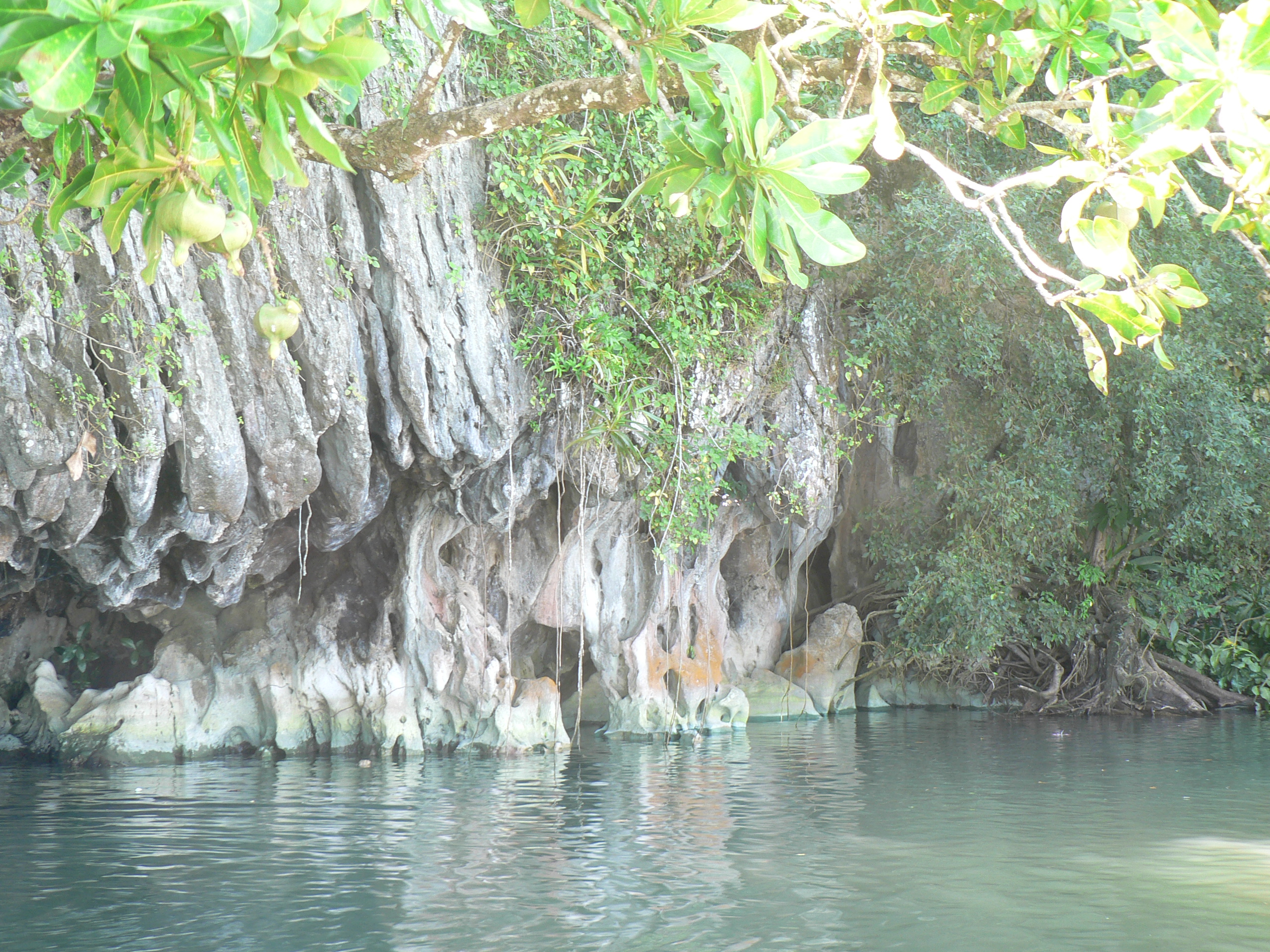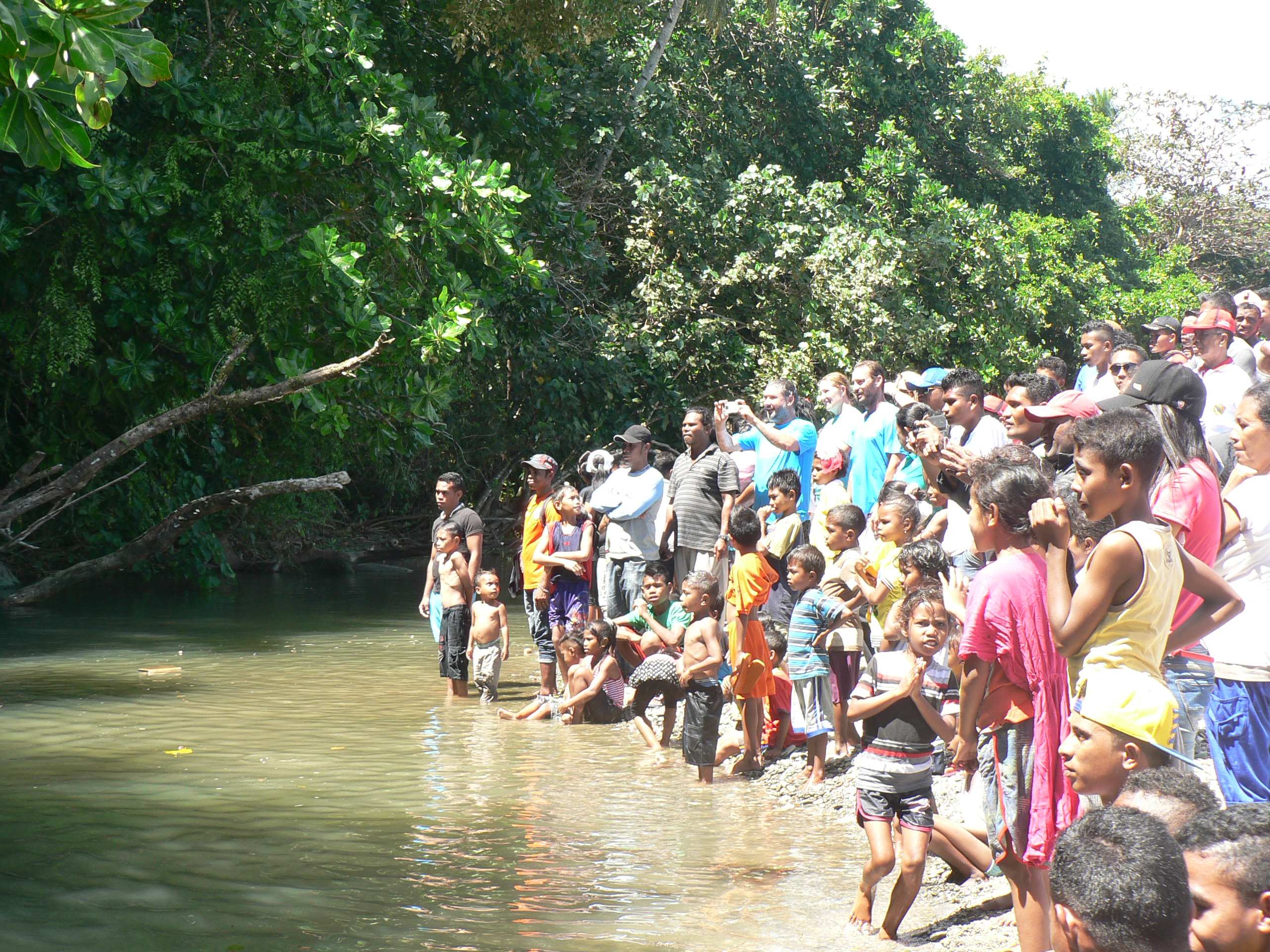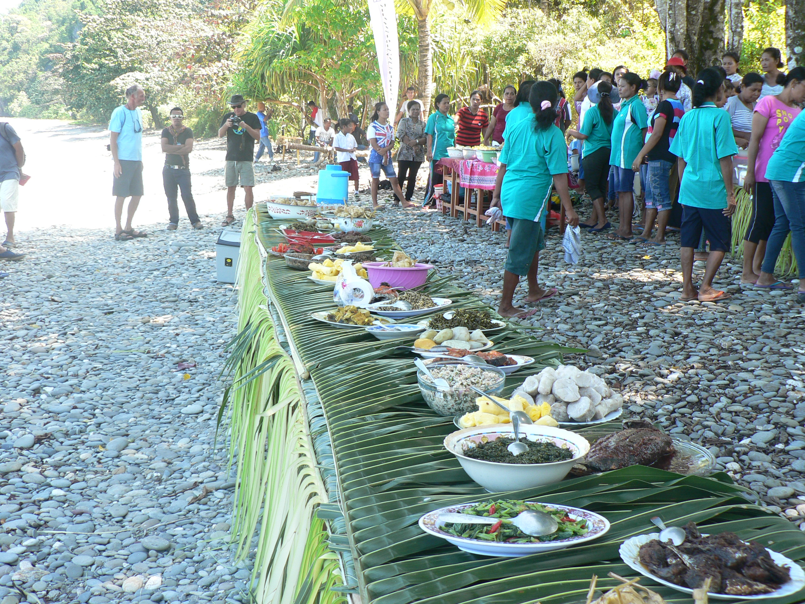 We were then led to the beach where they had set up seats for us in the shade in front of a long buffet table on which they served lunch. After lunch we were invited to swim in a sacred place so had to get ancestors blessing before-hand. The swimming hole was in a fresh water stream that emptied onto the beach. Phil could not resist and so he went in (water was pretty cold) and jumped from the branch into the stream a couple of times- just like Wuk Wuk river at Lindenow. Then loooong walk back to the harbour.