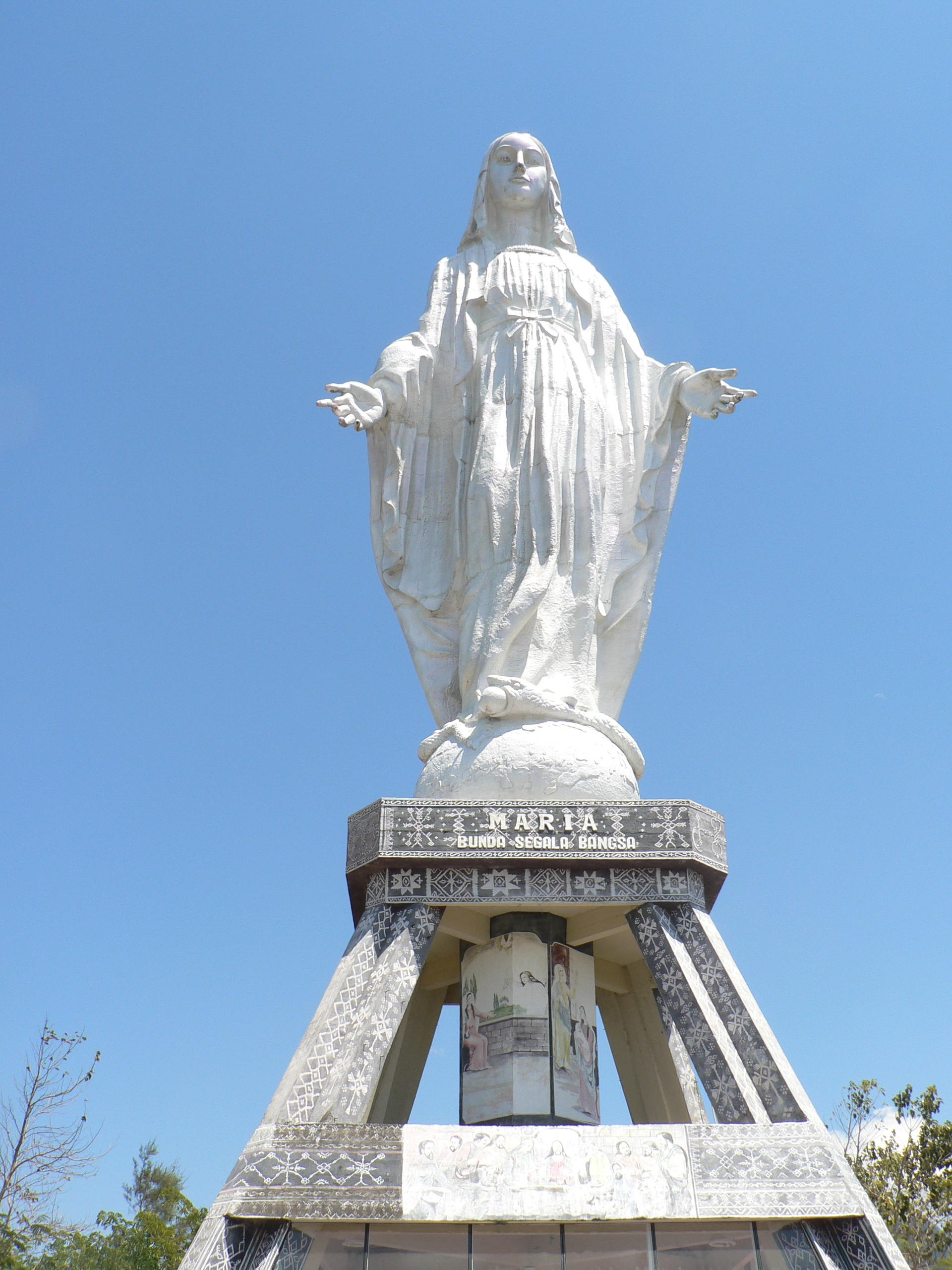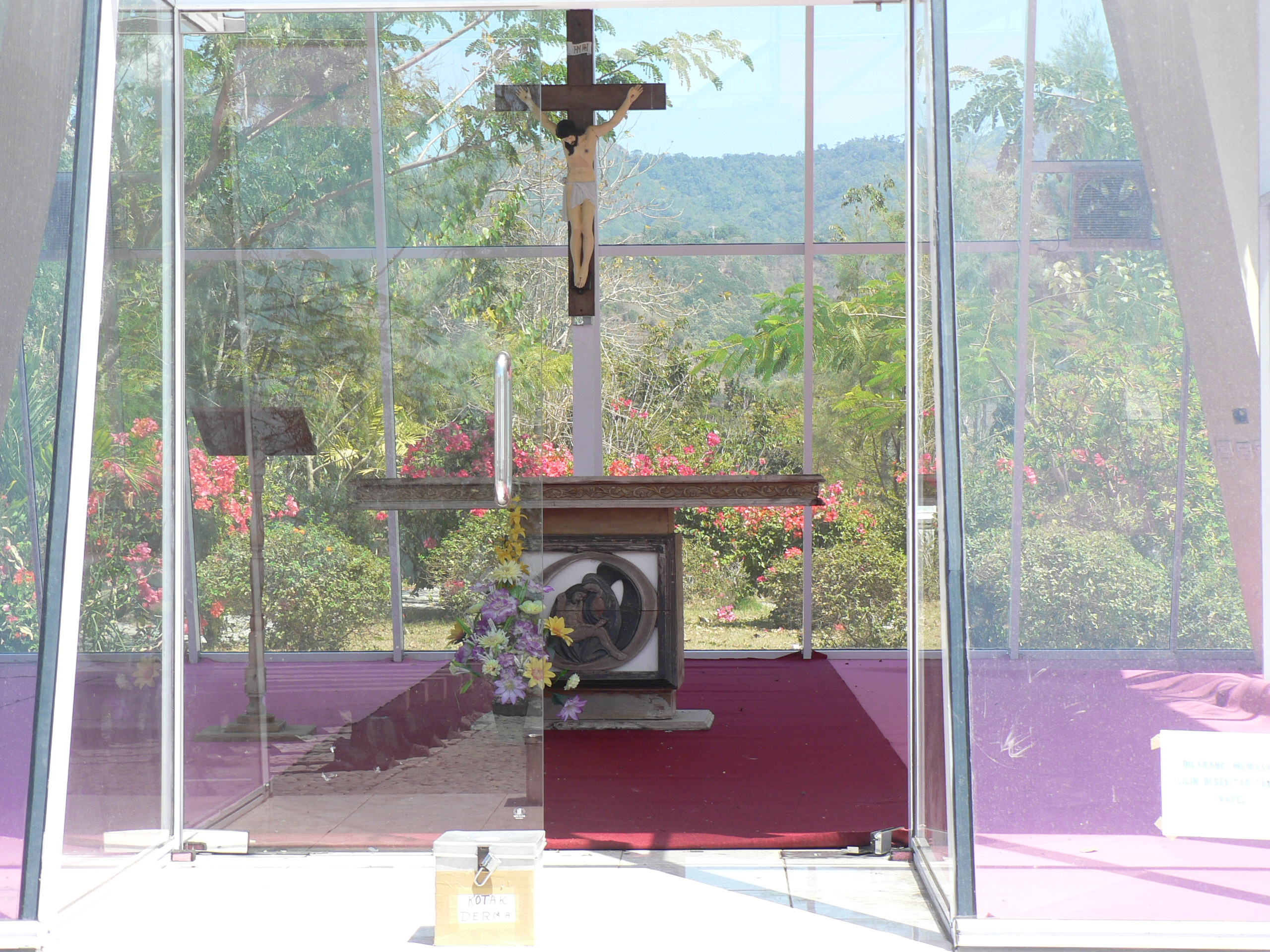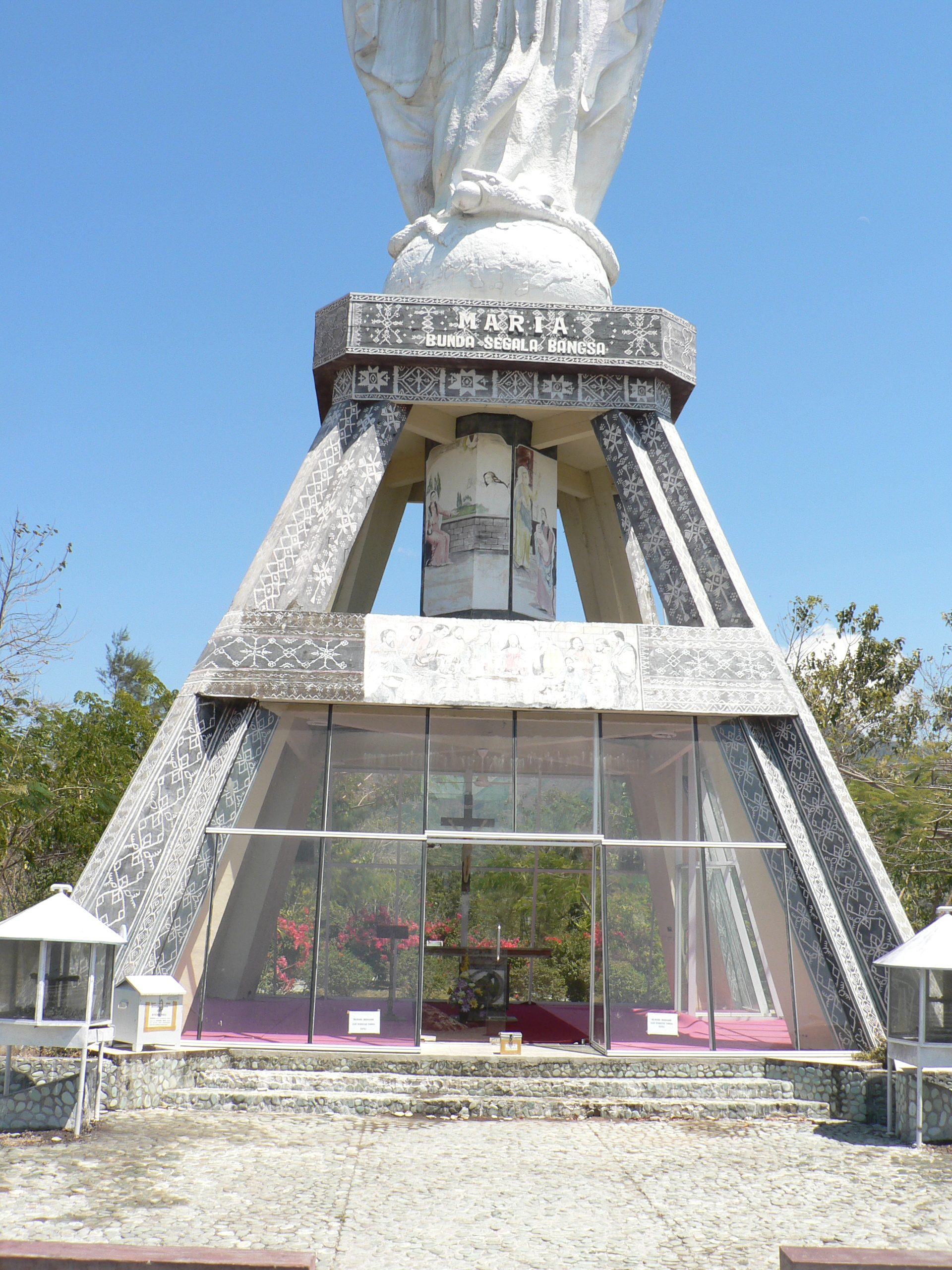 Second, at a Catholic outdoor church high up on the mountain overlooking Maumere. This was remarkable. The church consisted of a huge statue of the virgin Mary, under which was a chapel sized glass walled room containing an altar. The doors opened out to rows of pews situated in the middle of a garden. I’m not sure how this would work in the wet season.