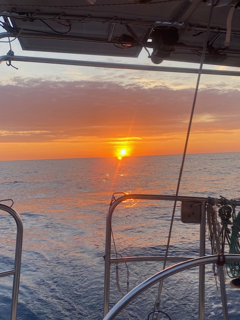 It’s 4am although I don’t know it. I’m sleepily tucked up in our bunk luxuriating in being off watch. But not for long. Phil comes to tag team and I so turn the bunk over to him and I’m up. Out on deck it’s quite a contrast to when I went off watch. There’s half a moon lighting up the ocean and twinkling stars in the sky. The wind is back in a more suitable direction and we are skimming along at a comfortable 5-6 knots. Earlier that night during my watch we had a period of very light inconsistent wind and lumpy seas resulting in flapping sails and clunking deck hardware.