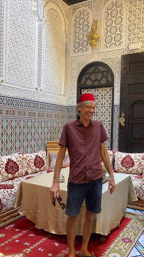 In most of the travel we have done, the accommodation is not usually a destination in itself but our riad in Fez certainly was. We were greeted at the door by two smiling young men looking very much the part in their fez hats, named after the city from where the red berries providing the crimson dye originated. When we entered the courtyard there was a collective “Wow!!!” from our group. What a sight!!! Tiles of different colours and shapes, gold lights, heavily embroidered fabric and of course beautiful carpet.