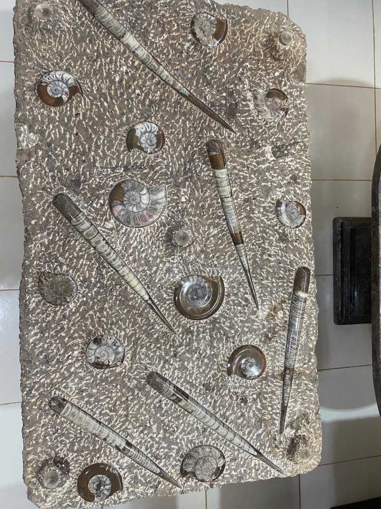 We had told Ahmed that we were interested in buying a bulk quantity of dates to split between us, so he took us to a local date market and helped in finding some quality dates and negotiated a price for us. We bought 13 kgs between the 4 couples and shared some with Ahmed and Nordin, our driver. In addition to dates, Morocco is also rich in fossils. In fact Ahmed’s father made his living as a fossil digger. We visited a fossil “factory” where the fossils are cleaned up and turned into some very creative pieces. The residue is given to the local boys who then chip away at it to find smaller fossils which they then sell to tourists on the road sides to supplement their family’s income.