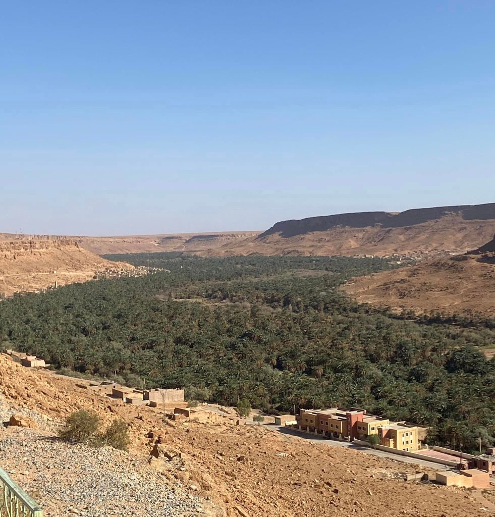 Ahmed really came into his own in the desert area. He took us into an oasis and showed us how the watering system works. We were surprised to learn that no people, or animals, live in the oasis. It is only used for cultivation. The oasis is crisscrossed with irrigation ditches which delineate the many plots. Each family in the area have a plot which they use to grow vegetables, herbs and the ubiquitous dates.