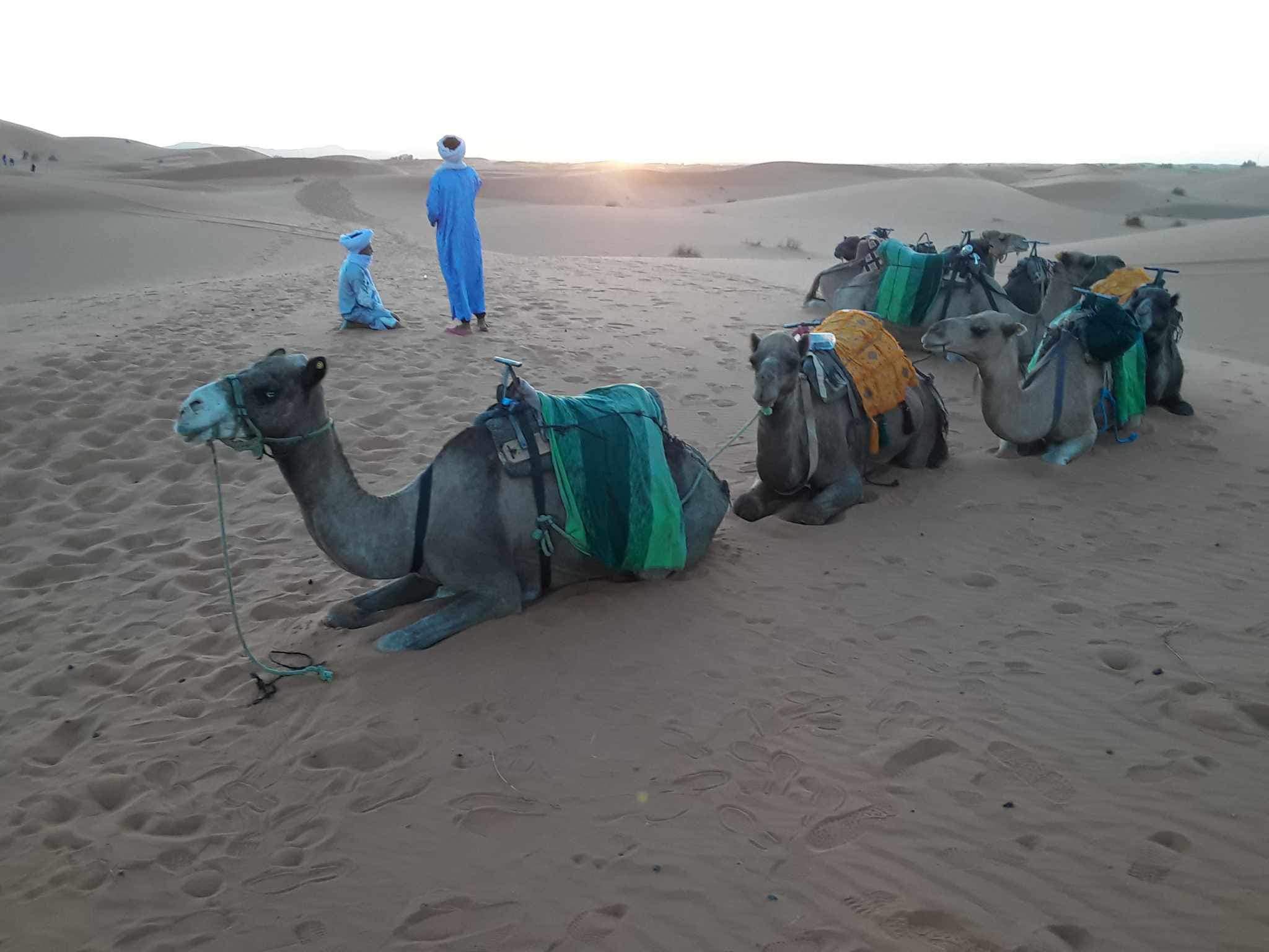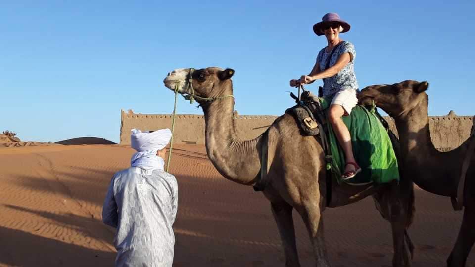 With much anticipation, we arrived in Merzouga on the edge of the desert, and here we found 8 camels saddled up and linked together, patiently waiting for us. I was a bit nervous about this camel ride. Well not so much the ride, although I had heard how uncomfortable it can be, but the staying on the camel while he (they were all male camels) stands up and sits down. Even though the desert sand would be a soft landing, I didn’t want to risk another broken bone! Ahmed, our guide, spoke to the camel handlers to ensure that they would keep a close eye on me and my camel so with this reassurance I was all in.