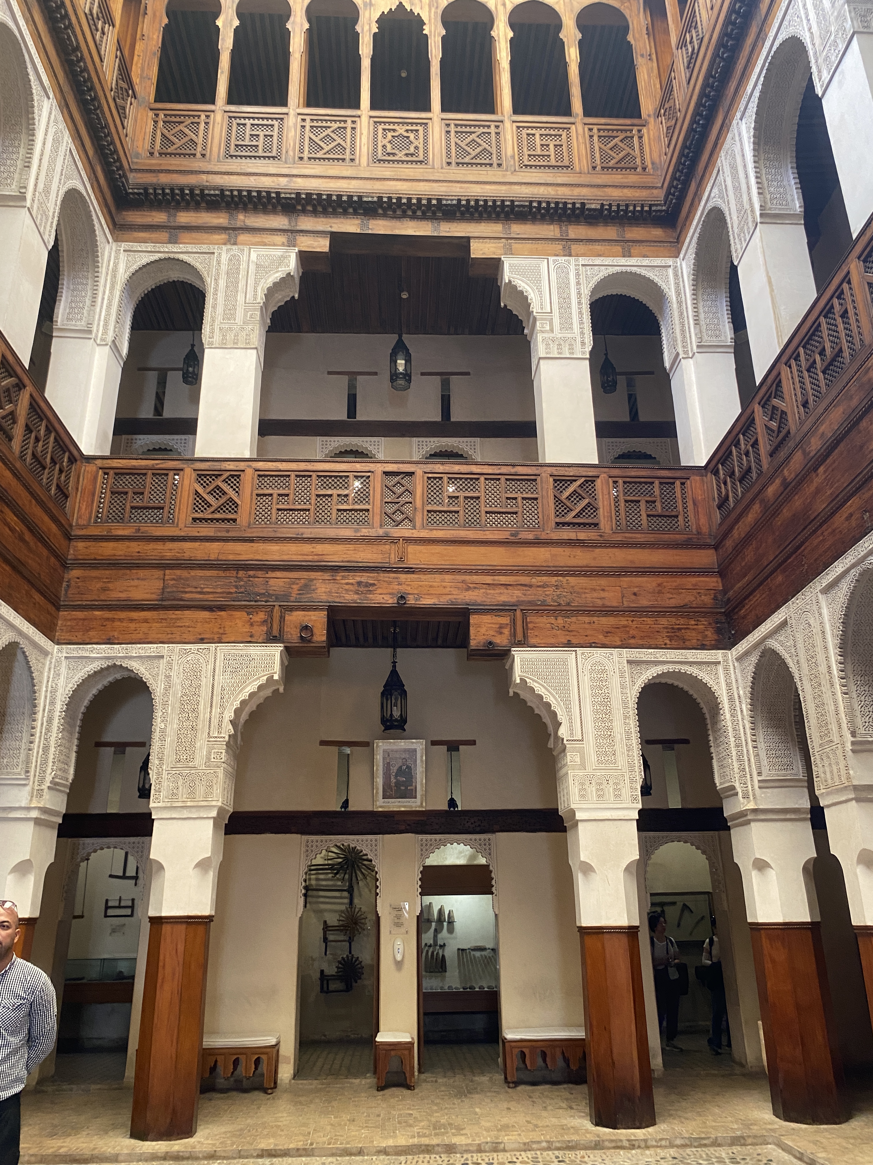 In most of the travel we have done, the accommodation is not usually a destination in itself but our riad in Fez certainly was. We were greeted at the door by two smiling young men looking very much the part in their fez hats, named after the city from where the red berries providing the crimson dye originated. When we entered the courtyard there was a collective “Wow!!!” from our group. What a sight!!! Tiles of different colours and shapes, gold lights, heavily embroidered fabric and of course beautiful carpet.