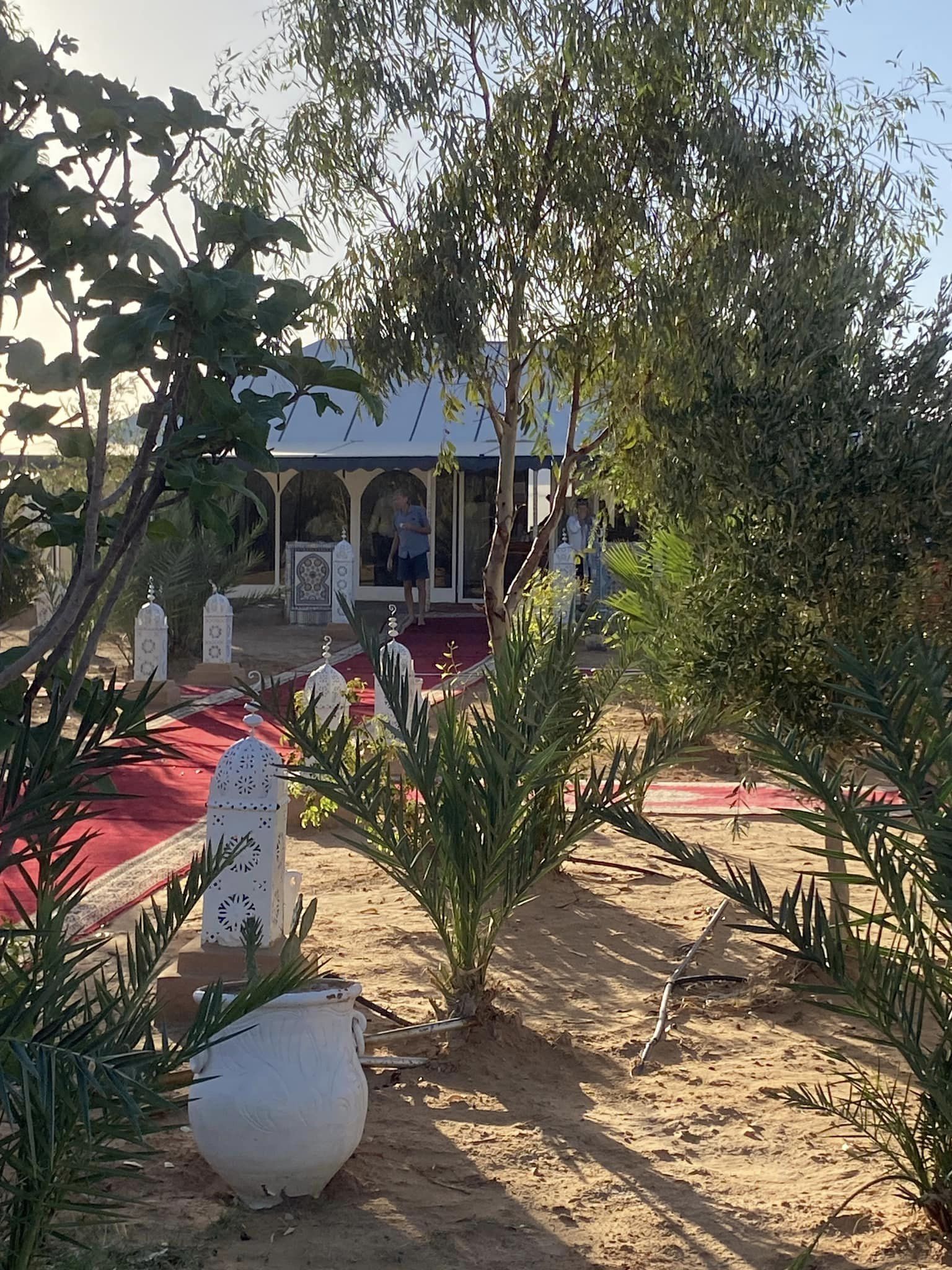 After 90 minutes, and a break to watch the sunset, we arrived in our desert camp in the dark, and gratefully dismounted the camels. I dare say that the camels were grateful too! I can understand why the guys leading the camel trains across the desert used to walk beside the camels, rather than ride them. We hobbled along the red carpet linking the dismounting area with the dining tent, soaking in the magical setting created by the many low twinkling lights showing us the way. After a late but tasty dinner, and some Moroccan music by the camp fire, we retired to our very well-appointed tents for the night.