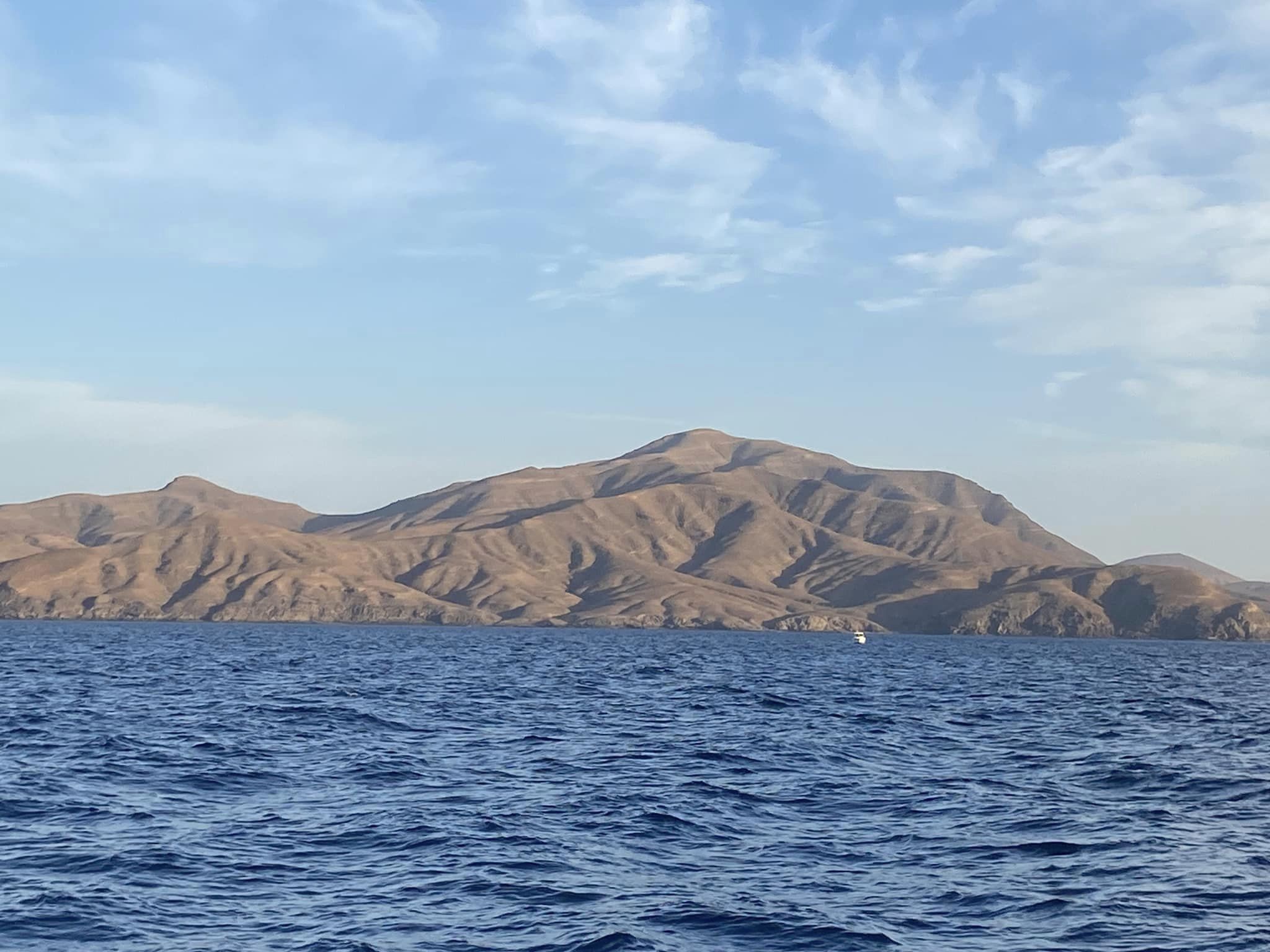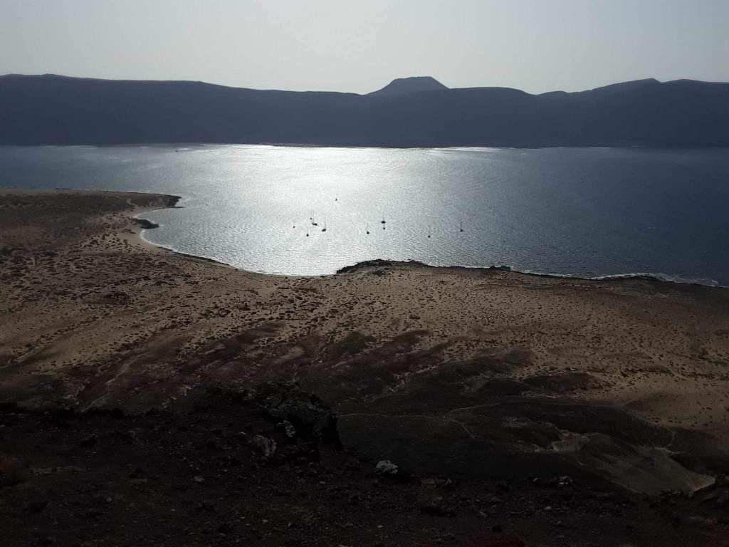 Our first landfall in the Canary Islands, a volcanic archipelago of seven main islands, was at Playa Francesca on La Graciosa. This is one of the smaller islands lying in the east of the Canary group not far off the west coast of Africa. And therein was our problem. The Calima, a hot strong easterly wind was blowing red Sahara sand across to us and covering everything with a layer of gritty dust. It was very hot as well. Talk about uncomfortable conditions!