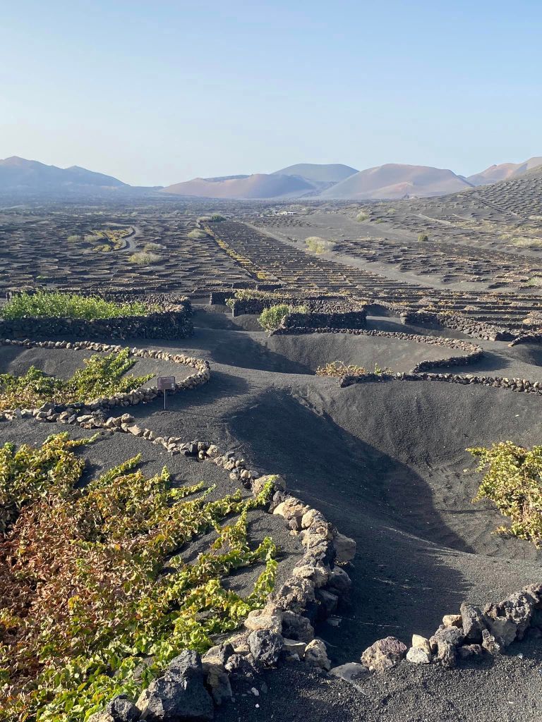 It rarely rains on Lanzarote. The average annual precipitation is less than 150mm, and it’s hot and also very windy. Despite these harsh conditions, a range of crops are grown there including onions, fruit, potatoes, green vegetables and grapes. As we drove across the island, the requisite ingenious farming methods were on display. Protection from the wind is provided by straight or semi-circular walls of lava rock, or sometimes by growing each plant in a large depression in the soil. Good use is also made of the protection afforded by the leeward side of hills. Then black volcanic crushed rock called picon is layered on top of the soil. Picon is porous enough to allow penetration by rain but almost eliminates evaporation. Good spacing between the plants allows the foliage to directly absorb moisture from dew and mist. The combined effect creates a micro-climate which allows cultivation in this arid country, where irrigation is not always available or affordable.