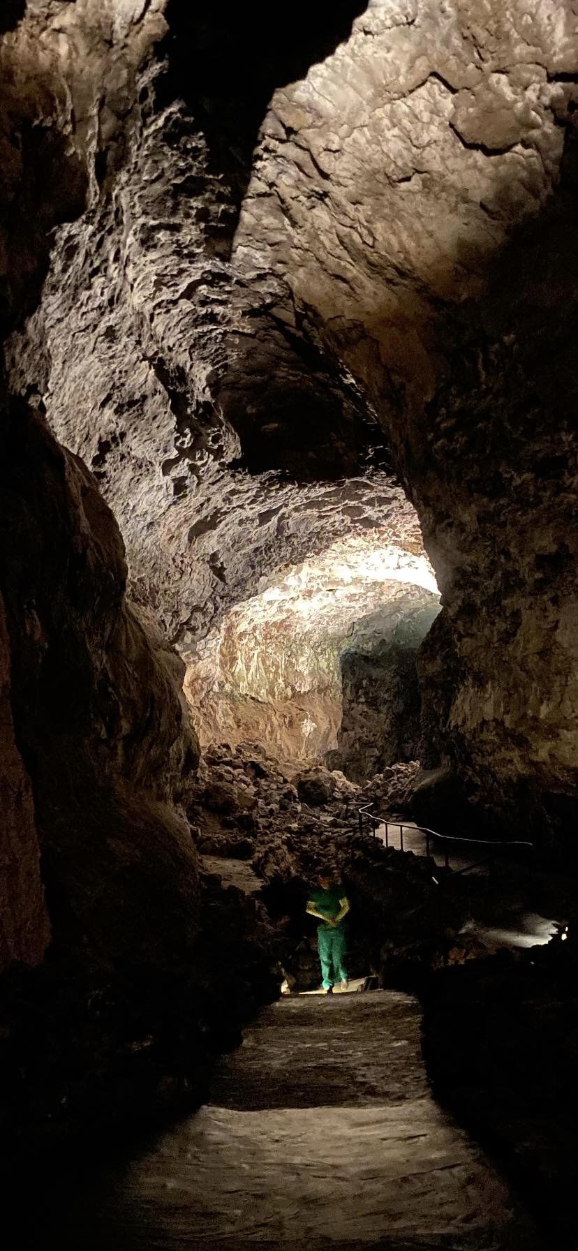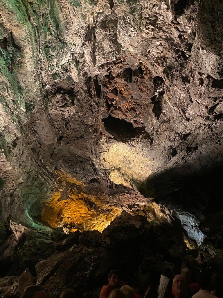 A highlight of our day trip was a visit to Cueva de los Verdes, a cave in the Tunel de Atlantida. This tunnel is a lava tube that was created by the eruption of the Corona Volcano 20,000 years ago, on the north of Lanzarote. It runs 7 kms underground from the volcano to the east coast and out under the sea. The Cueva de los Verdes is an opening into the lava tube and the cave and a section of the tunnel have been set up to allow tourists to experience the lava tube. Various parts of the tunnel are lit with coloured lights which, while artificial, creates a form of art from nature. The only way to see the tunnel is with a guided tour included in the entrance fee. We spent a wonderful hour or so immersed in this amazing tunnel created by a volcanic eruption.