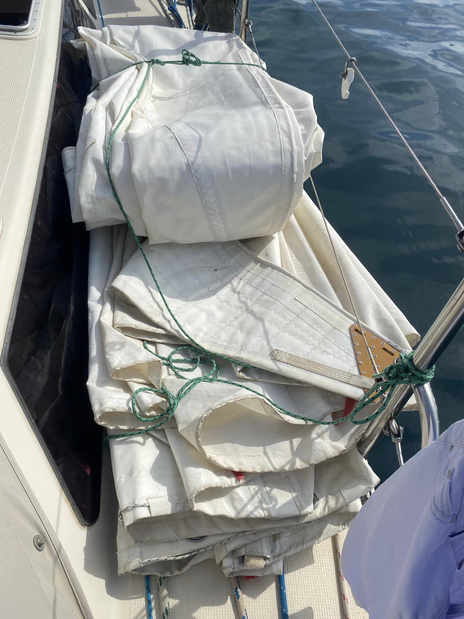 We had a bit of kerfuffle aboard on the leg to Gran Canaria when a bolt holding the end of the boom to the mast came loose allowing that end of the boom to fall onto the cabin top. This in turn put strain on the slides holding the mainsail to the mast and broke several of them. Fortunately this occurred during daylight hours which made it much easier to drop the main, take it off the boom, secure it to the deck, and then re-attach the boom to the mast. It did mean though that for the rest of the passage, we could only use the headsail.