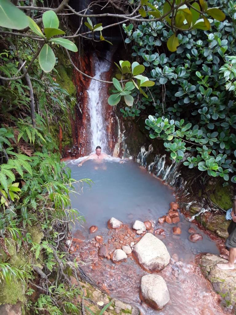 Trafalgar Falls are actually a pair of waterfalls separated by a rocky headland, with the unique feature of a hot spring to one side of the bigger of the two falls. These falls are very easily accessible from a nearby bus stop. I enjoyed the challenge of scrambling over the rocks, with help over the hard bits from Phil and Adrian, to access the hot springs. What absolute luxury! I found my sweet spot where I could sit in a pool with a small warm waterfall from the hot spring massaging my neck and shoulders while the rest of my body stayed refreshingly cool in the water flowing from the waterfall. And even better, we had this whole area to ourselves for about 2 hours.