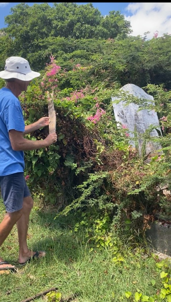 Next stop was the cemetery and here we did indeed find gold – well not real gold, but family history gold. On arrival we found a lovely big tree under which to have our picnic lunch (I know, it’s an unusual spot for a picnic) and then started a methodical search of the graves. Little did we know that right near our picnic spot, buried underneath some very prickly bushes, was a very significant family grave – that of George and Susan Ilidge who were prominent citizens in Sint Marrten and closely involved in the Methodist Church. We were very happy that we had found it.