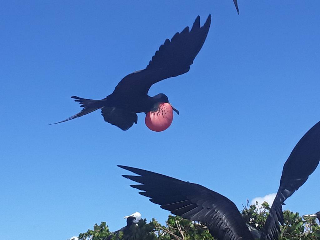 It was quite a long ride across Codrington Lagoon to the colony. It was lovely to motor slowly through the mangroves and see these large birds roosting in the trees. We saw adult male and female birds, juvenile birds and also a few chicks still with their fluffy white feathers. I wouldn’t say they are a beautiful bird, although they have a large wingspan. It turns out that they also have some dubious hunting techniques. They have little oil in their feathers and so can’t dive into the water to fish, rather they scoop the fish up from just below the surface. But they also bully other smaller birds into dropping their catch and then scoop it up mid-air.