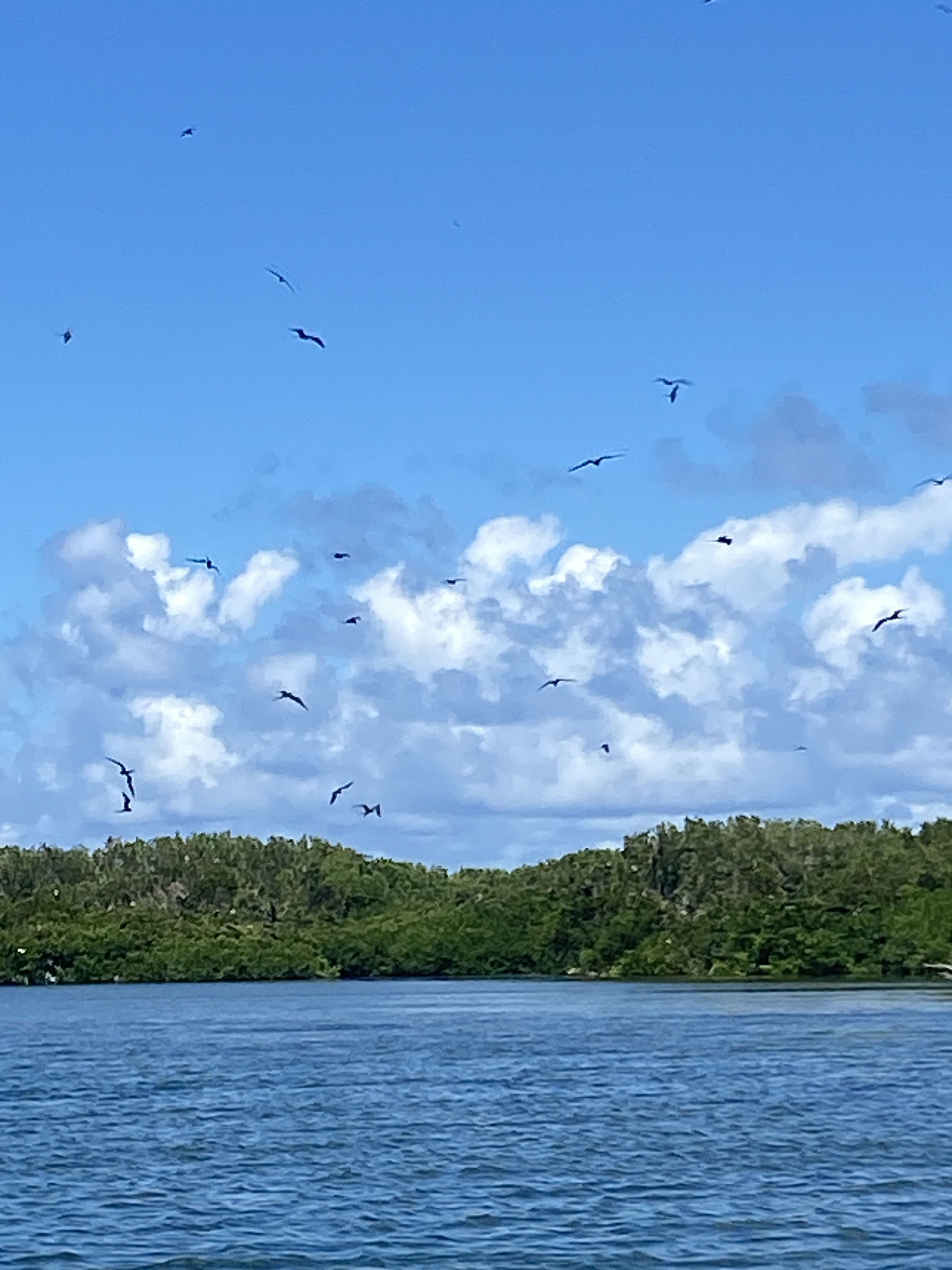 It was quite a long ride across Codrington Lagoon to the colony. It was lovely to motor slowly through the mangroves and see these large birds roosting in the trees. We saw adult male and female birds, juvenile birds and also a few chicks still with their fluffy white feathers. I wouldn’t say they are a beautiful bird, although they have a large wingspan. It turns out that they also have some dubious hunting techniques. They have little oil in their feathers and so can’t dive into the water to fish, rather they scoop the fish up from just below the surface. But they also bully other smaller birds into dropping their catch and then scoop it up mid-air.