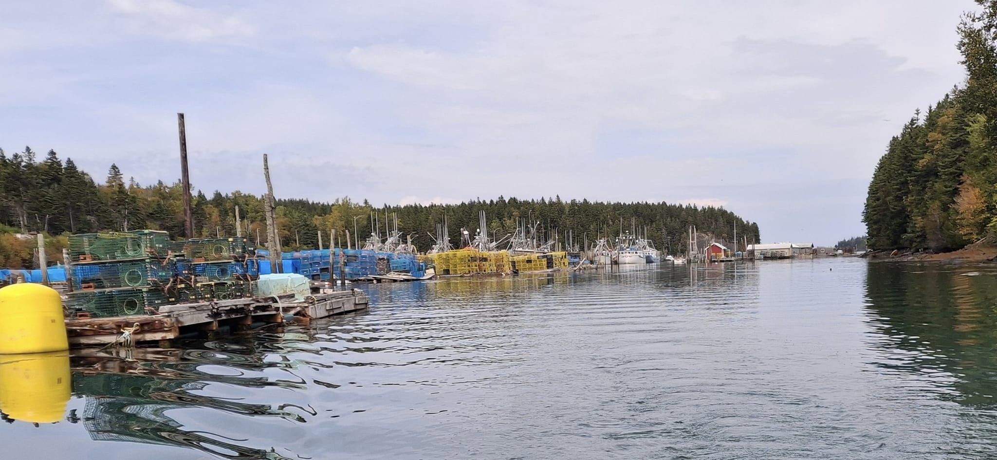 The next day we positioned ourselves in another anchorage at the north of Campobello ready for a quick departure to the US the next morning. What a contrast this anchorage was to all the beautiful ones we had relished in Nova Scotia. We were in a large and well protected cove that served as a base for the local lobster fishing boats. There was a lot of decaying infrastructure, floating pontoons piled high with lobster pots (all out of the water until next season), floating sheds, and lots of debris in the water.