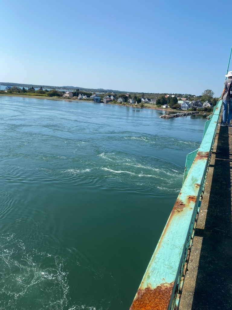 Goodbye Canada, temporarily. On the right, you can get a sense of the amount of water flowing out into the Bay of Fundy, and the strong current it generates