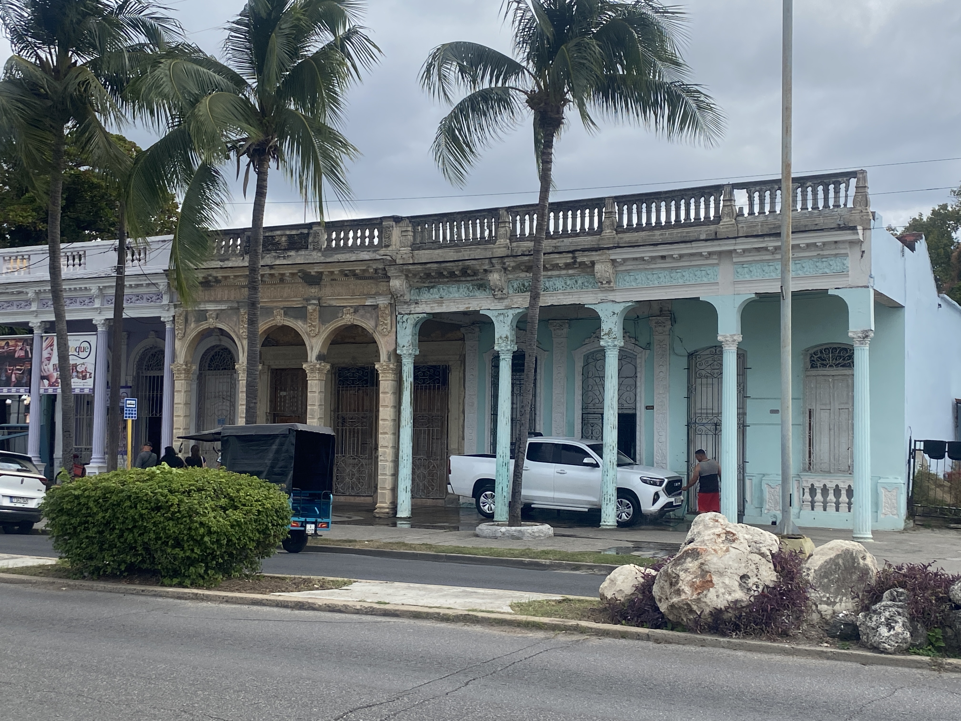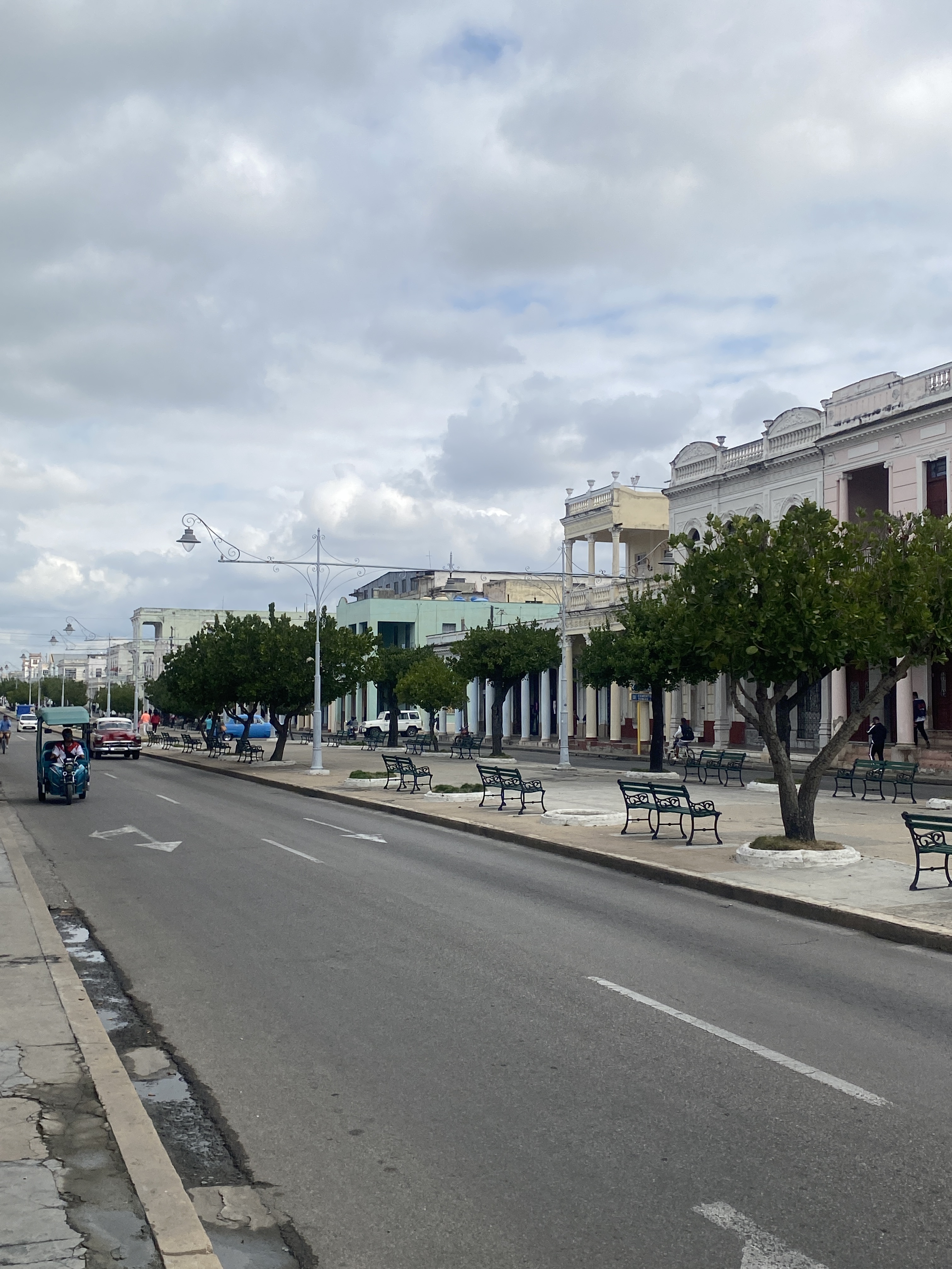 Cienfuegos main street: These little terrace houses must have been very pretty. Note the wide street, and the period lights
