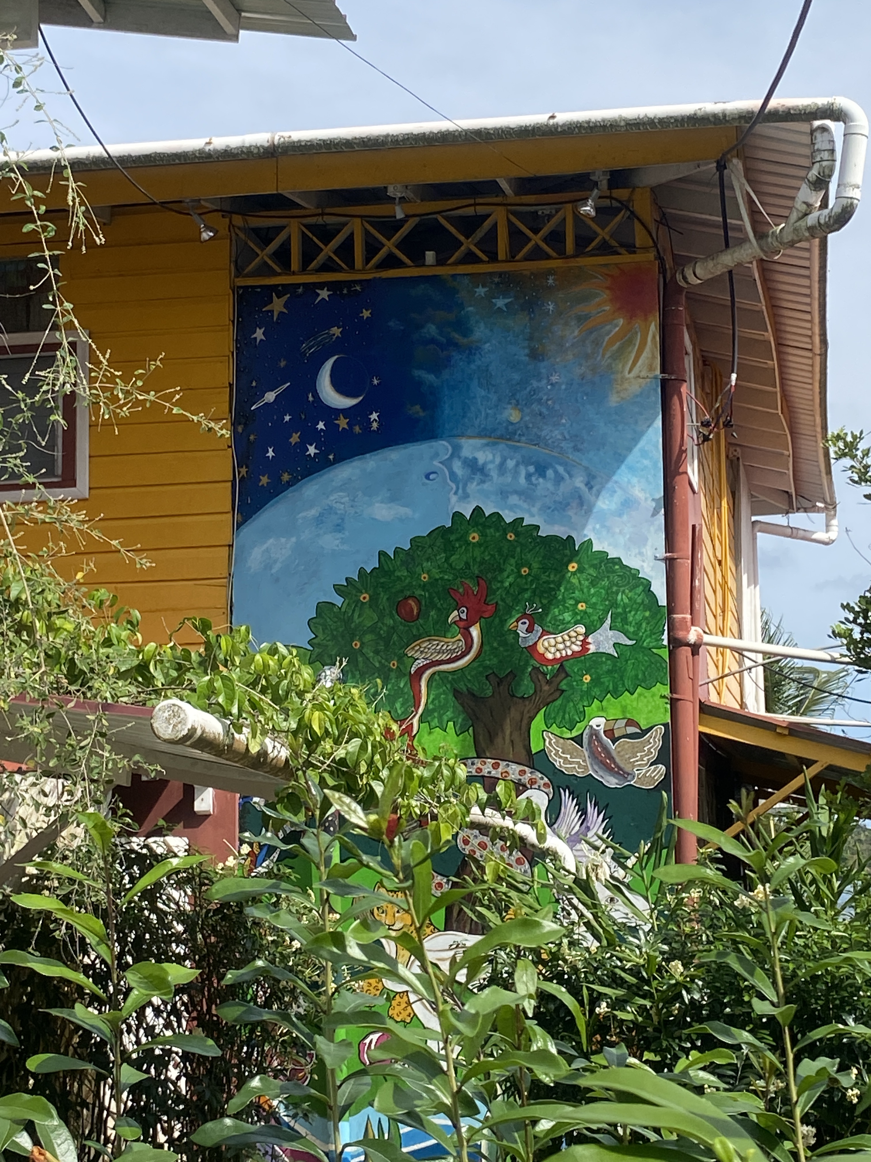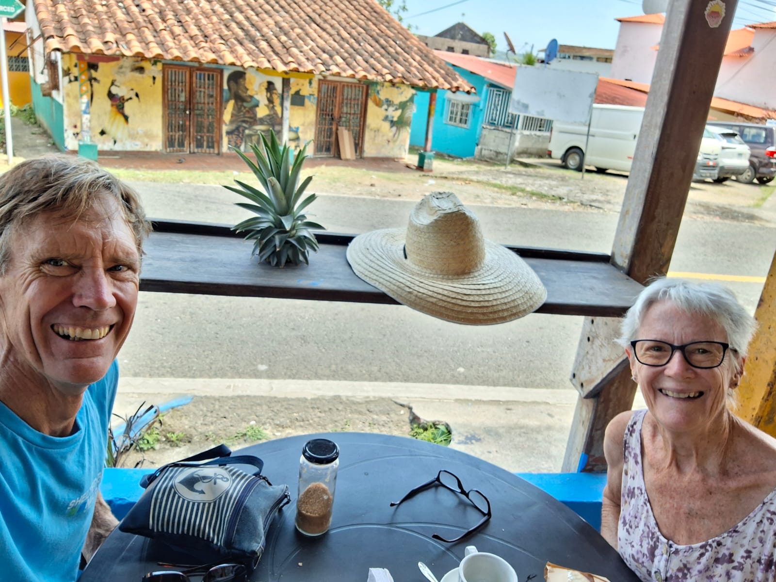 The next, and more popular anchorage, along the way was Linton Bay, which to our mind is nowhere near as nice a Portobello. However, it does have a very good chandlery where we bought the anti-foul paint we will need when we haul the boat out in the Marquesas. Nothing like planning ahead with your purchases. While we were in the chandlery, we walked past another customer, saying hello in the process and there was that moment each party recognizes the other. We started chatting trying to work out the connection. Eventually when he mentioned that his boat was registered in Zanzibar, Tanzania, I put the pieces together. This was Jason, the manager of a small boat yard at the Slipway anchorage, near Dar Es Salaam, where we were anchored for a while in 2018! Seven years ago. There was great excitement in seeing each other again, and so of course we immediately retired to the bar upstairs and caught up with each other’s news over a few ales. Covid had caused the closure of the Slipway yard and so Jason decided to sail away in his tiny 25-foot boat. He had it shipped into the Med, crossed the Atlantic and spent time in the eastern Caribbean where he had the frightening experience of being caught in Carriacou when Hurricane Beryl hit. We had a great time hanging out together and reminiscing.