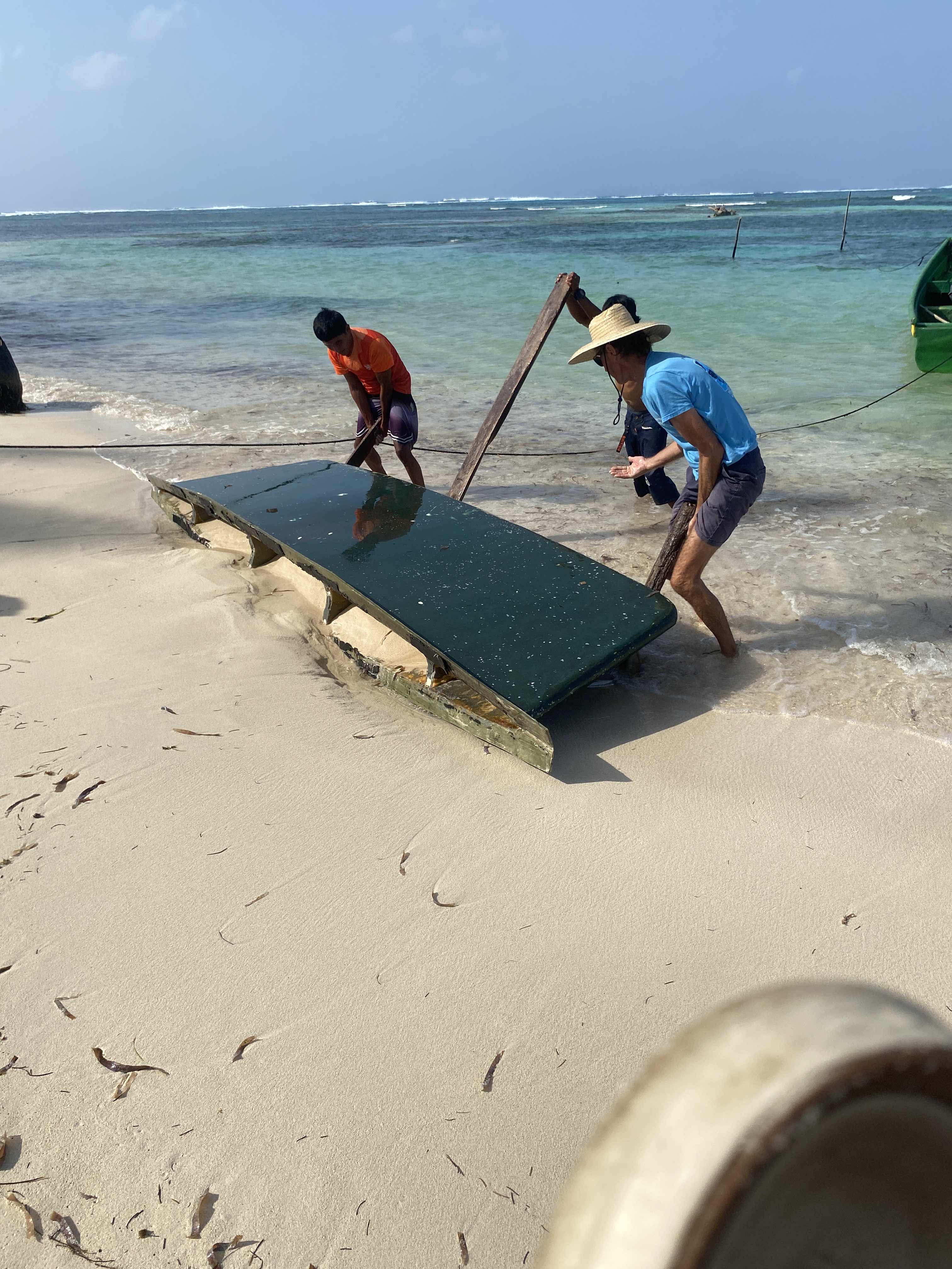 Getting involved with the locals in San Blas – Phil helping move a piece of debris and the Guna women showing us their crafts