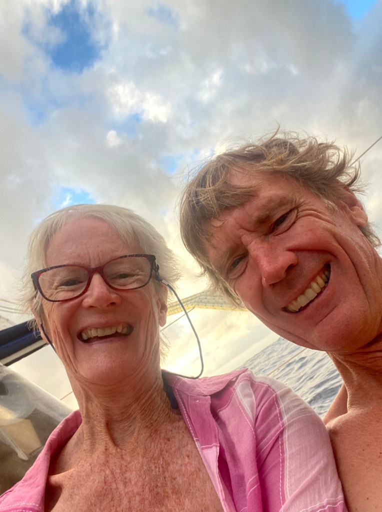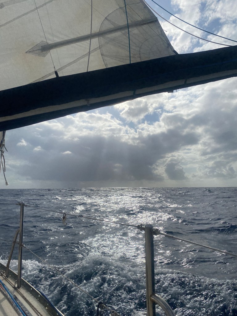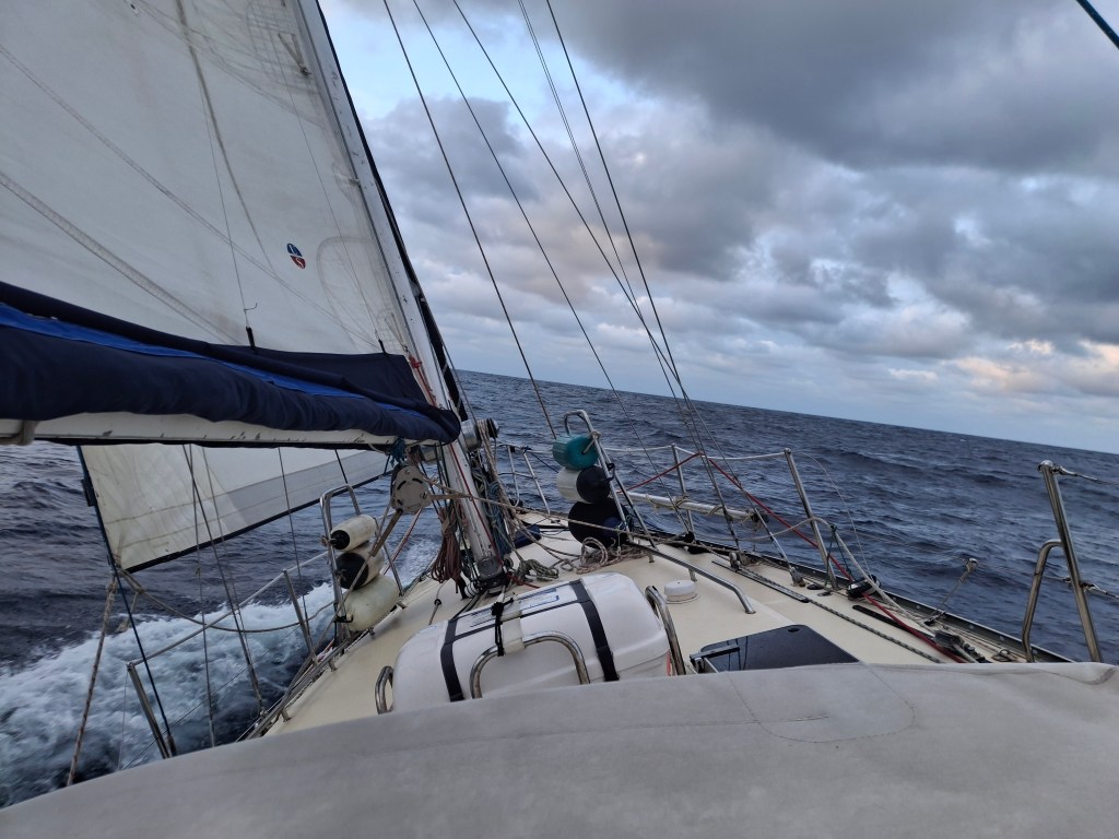 A cloudy sky greeted us on our second  morning and we didn’t see the sun for the rest of the day. I started my passage routine of checking for messages and sending position reports, and then after breakfast, did a welfare check on our fresh food supplies and turned the eggs over. Apparently the air sac inside the egg getting stuck to the shell allows air into the egg  which hastens rotting. Turning the eggs regularly helps to stop the air sac from getting stuck. For the record, it seemed to work as we didn’t have to throw any eggs overboard. We even had a few left at the end of the passage.