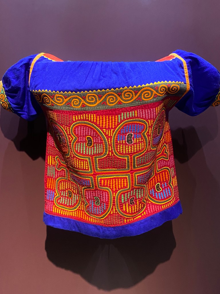Two of the gorgeous mola exhibited in the museum. The left hand one features triangles which represent huts and so protection by the home, and vertical slots representing the sun shining through the bamboo walls of the home indicating protection by family. The right hand one features labyrinths to trick evil spirits into getting lost, and zig zag teeth to eat the spirits that don’t get lost.