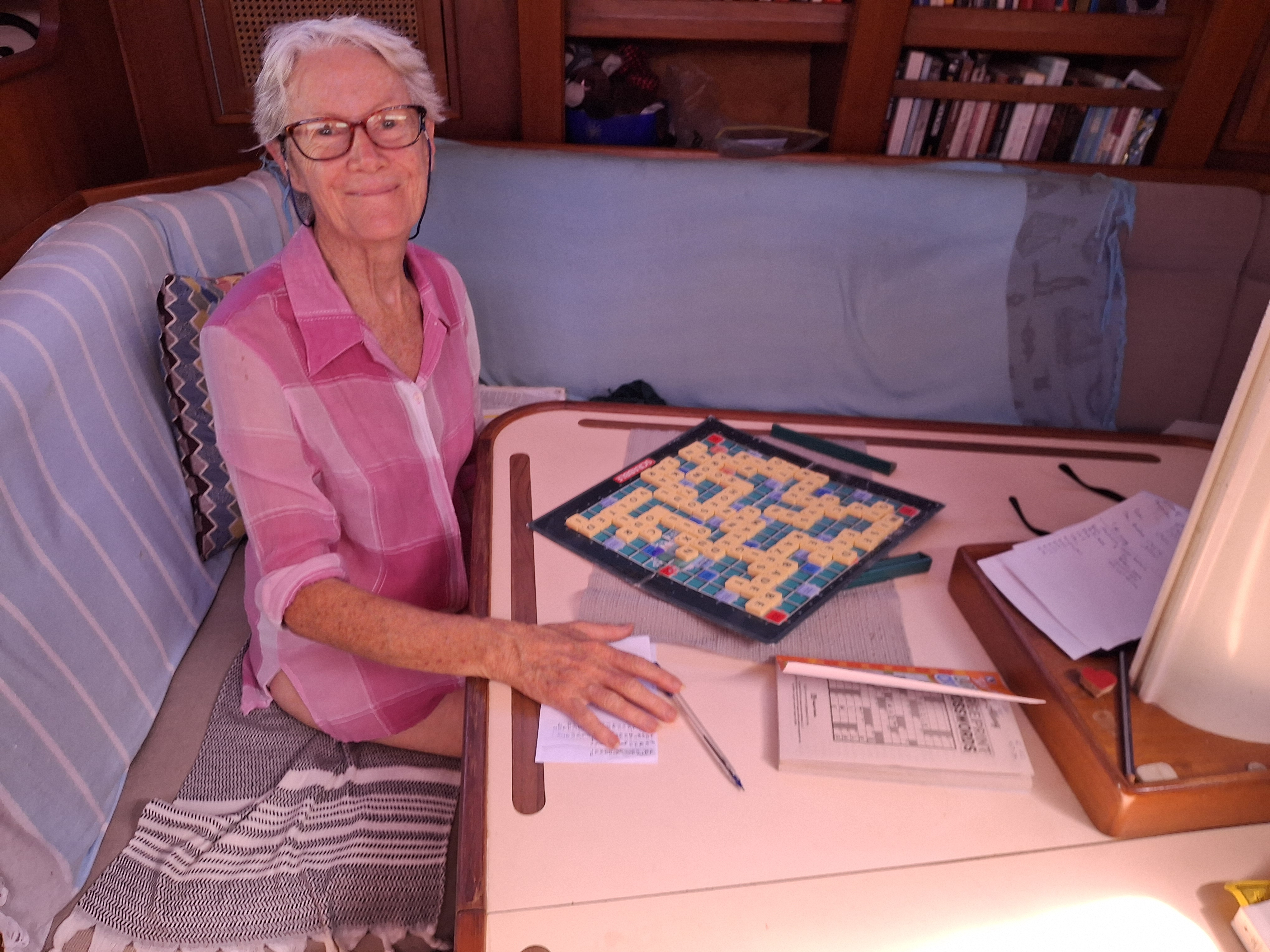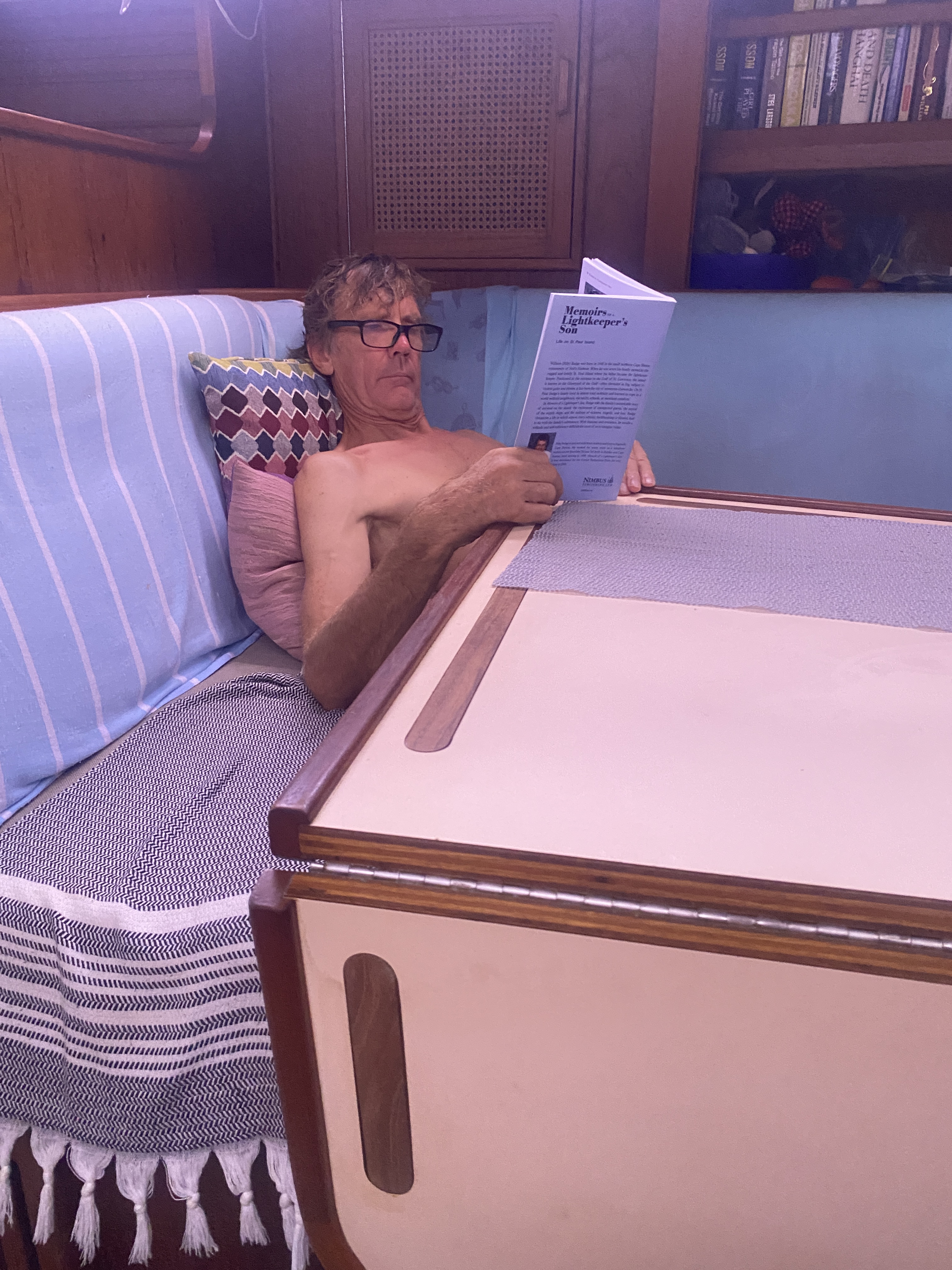 A cloudy sky greeted us on our second  morning and we didn’t see the sun for the rest of the day. I started my passage routine of checking for messages and sending position reports, and then after breakfast, did a welfare check on our fresh food supplies and turned the eggs over. Apparently the air sac inside the egg getting stuck to the shell allows air into the egg  which hastens rotting. Turning the eggs regularly helps to stop the air sac from getting stuck. For the record, it seemed to work as we didn’t have to throw any eggs overboard. We even had a few left at the end of the passage.