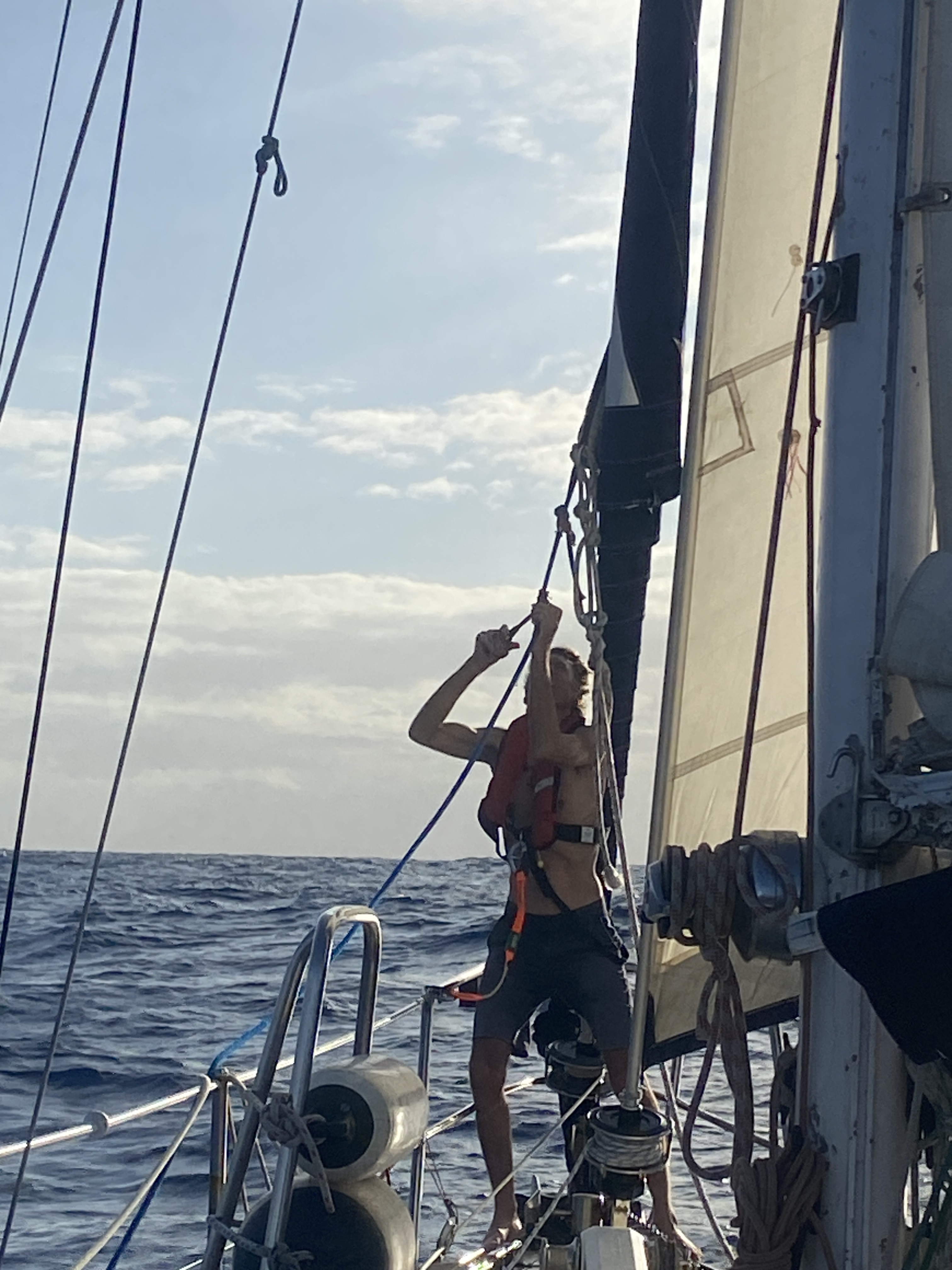 Phil attending to some foredeck jobs: removing dead fish, this one from the main sail bag, and tying some leather around the headsail sheet to prevent chafe which was a major problem for our running rigging