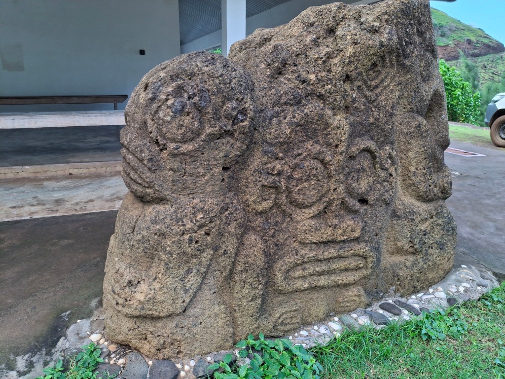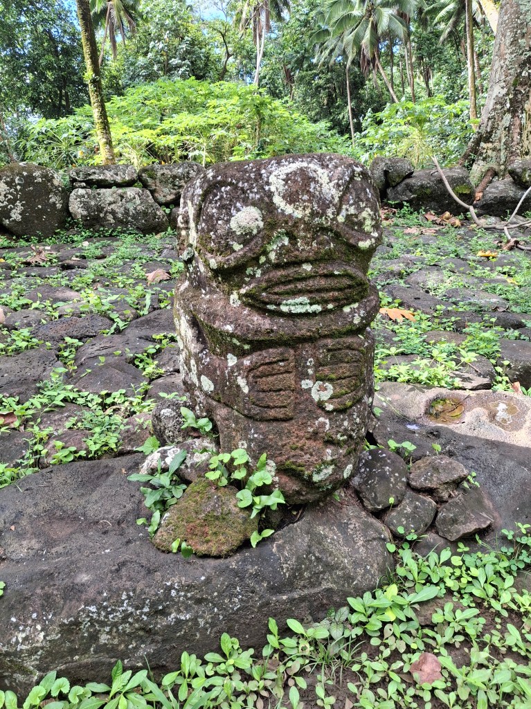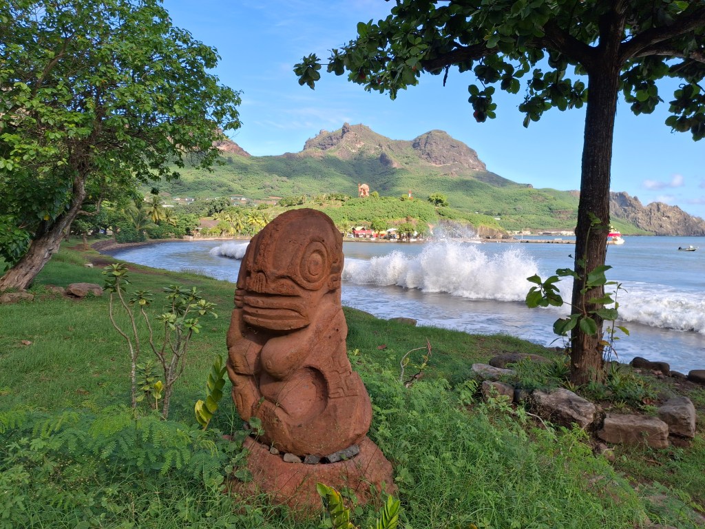 We walked from our anchorage on Ua Huka around a headland and into the next village where there supposedly was a wood carver who ran half day workshops on making a tiki. We found his house just outside the village but apparently he had moved to one of the bigger islands so no tiki workshop for us. But a tiki was waiting for us.