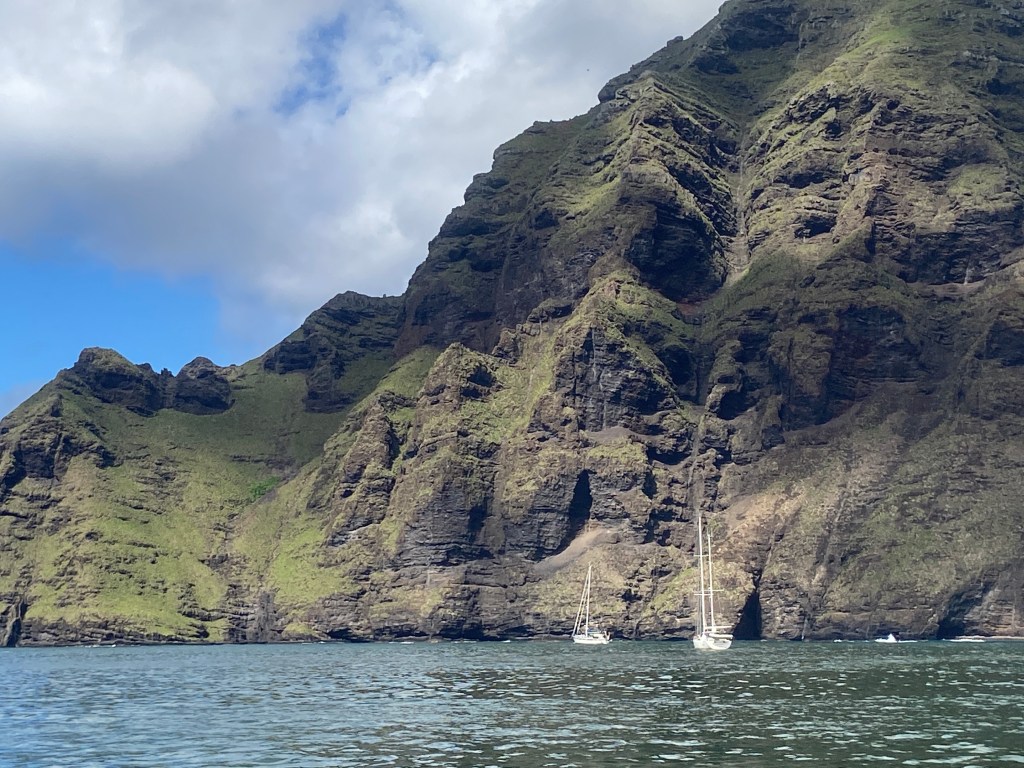 We spent my actual birthday in a spectacular anchorage called Hakatea Bay also on Nuku Hiva. Entering the bay requires you to sail almost right up to an incredibly tall and steep mountain before turning hard right to get into the anchorage itself.
