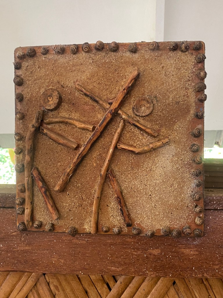 On our way through the village, we had passed a woman sitting in a wheel chair outside her house. She had a lovely open face and smile and started chatting to us. With my limited French and her limited English, we managed to understand that she wanted to show us the artisanal woodwork shop. We politely declined, not wanting to be the only potential buyers but also because we were saving our cash for the woodwork workshop. However, she was still waiting to see us on our way back and this time we agreed since the workshop idea had not come to pass. She had clearly had a stroke but nonetheless she wheeled herself down the very bumpy street to the artisanal which she opened up for us. What a surprise -the place was like a woodwork warehouse! It was packed full of some really excellent pieces, and here we found our tiki.