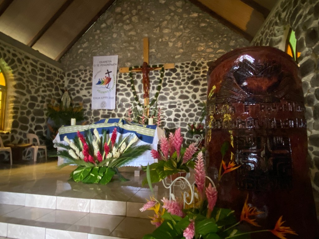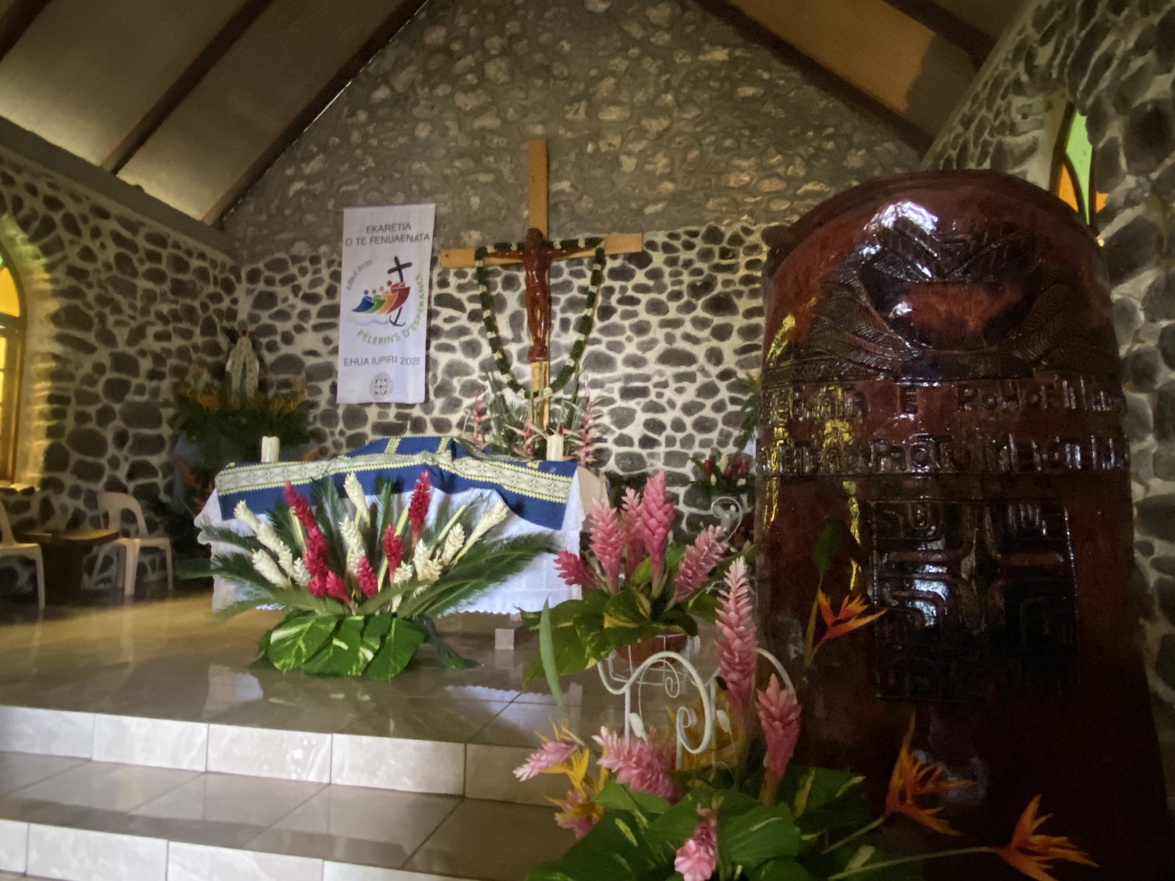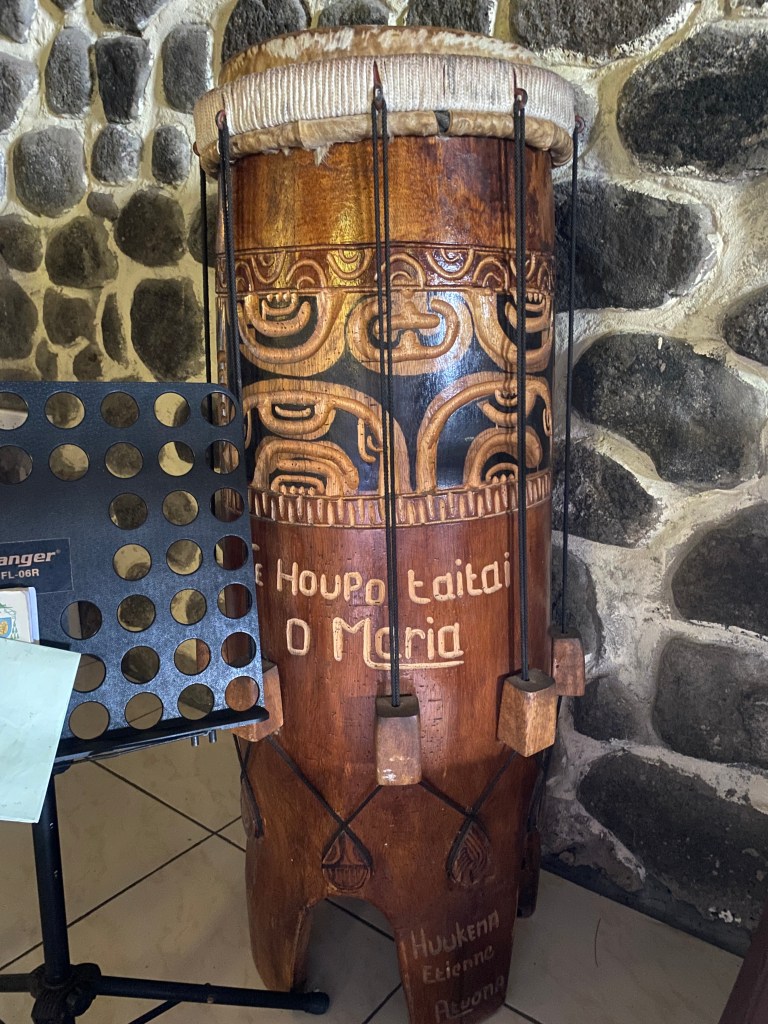 The churches here are just gorgeous. Every village, however small, has one. They are beautifully decorated with locally available materials -wood, shells, flowers, palm fronds. Each one has a drum rather than an organ. I had been wanting to attend a mass to hear the singing and on Ua Huka, one of the smaller Marquesan islands, I had the chance to do so. I’ll never forget the thrill in my heart at the first sound of their uplifted voices.